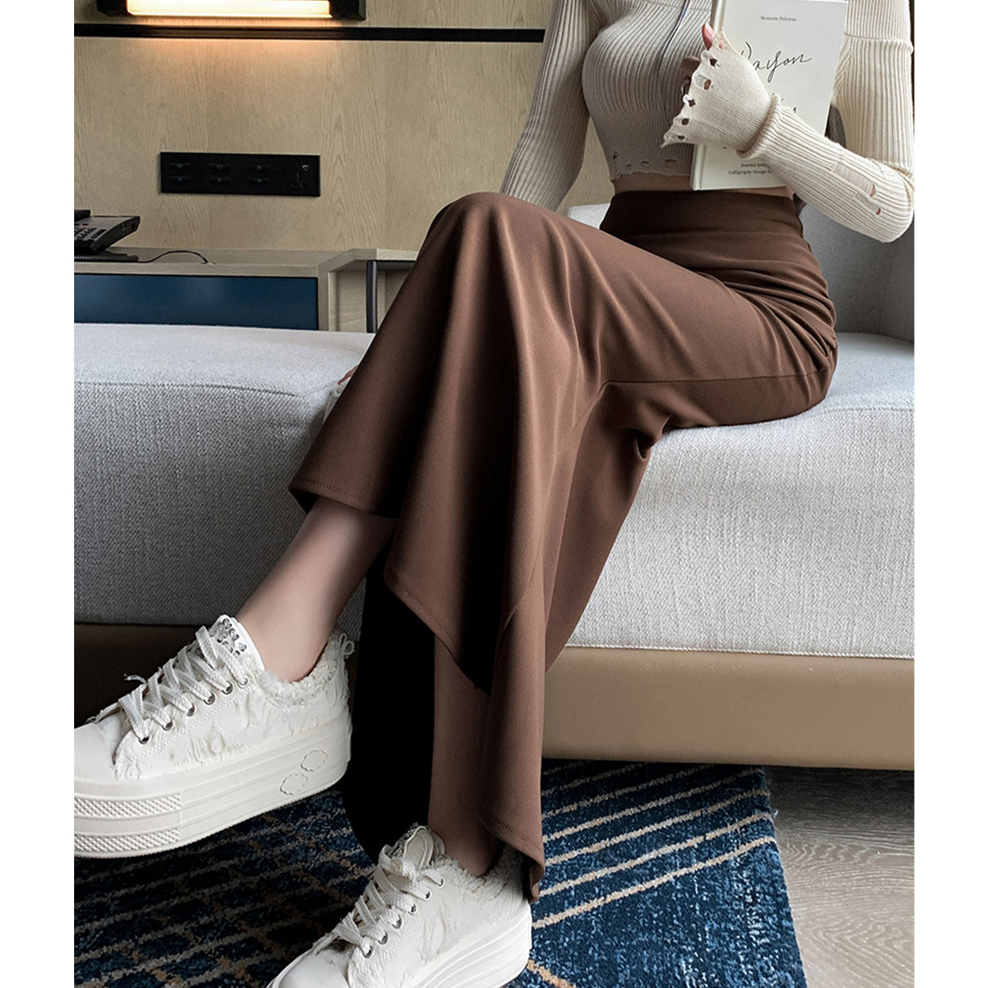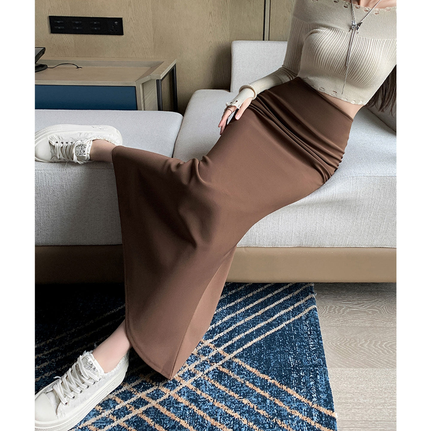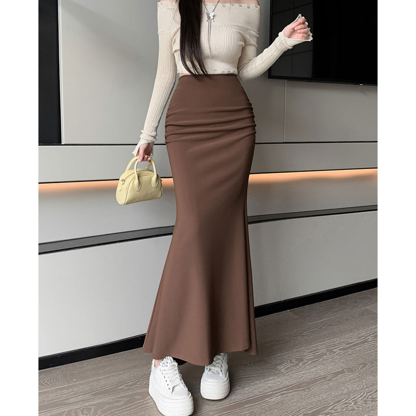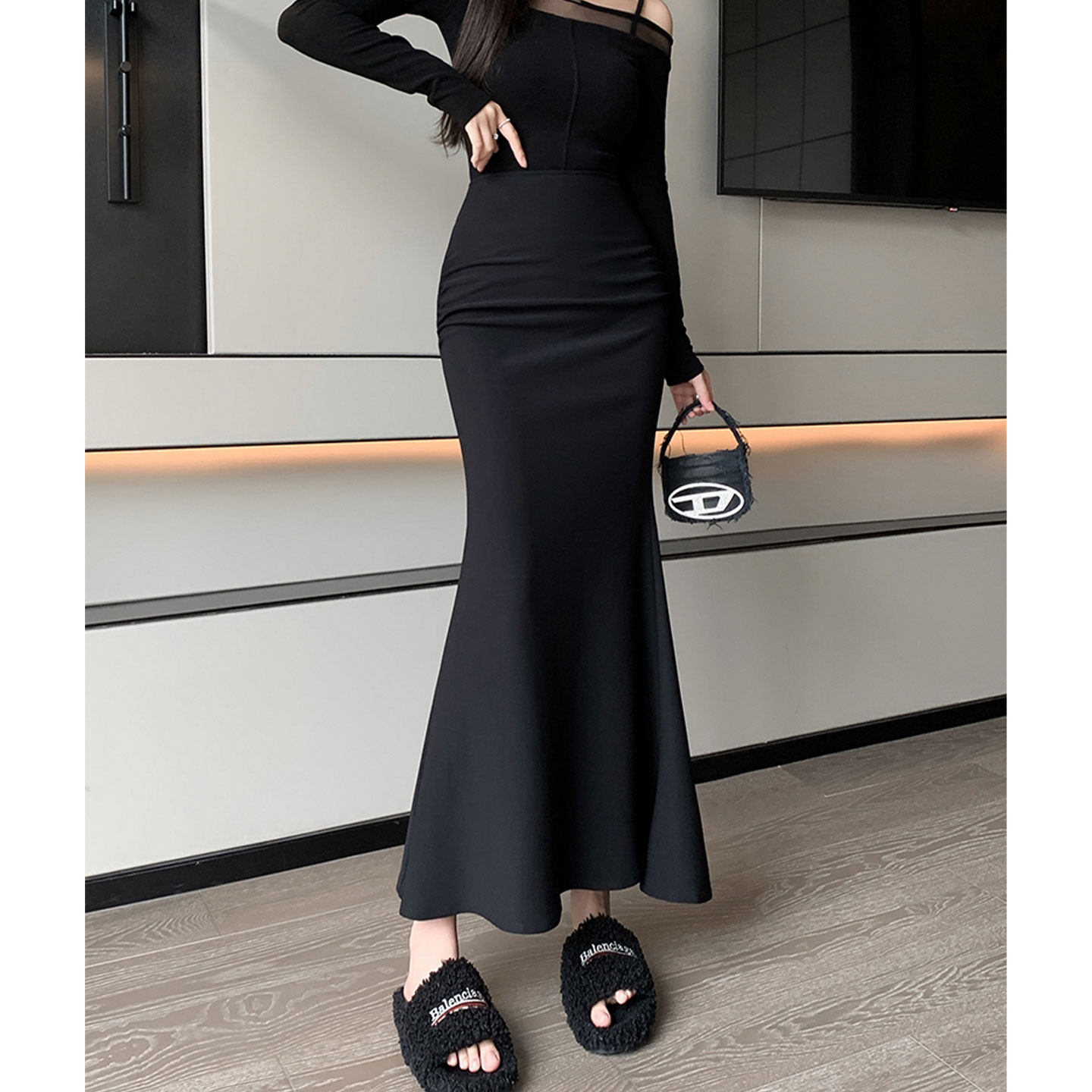 绝美黑色弹力褶皱包臀半身裙女秋冬中长款显瘦气质修身鱼尾长裙子