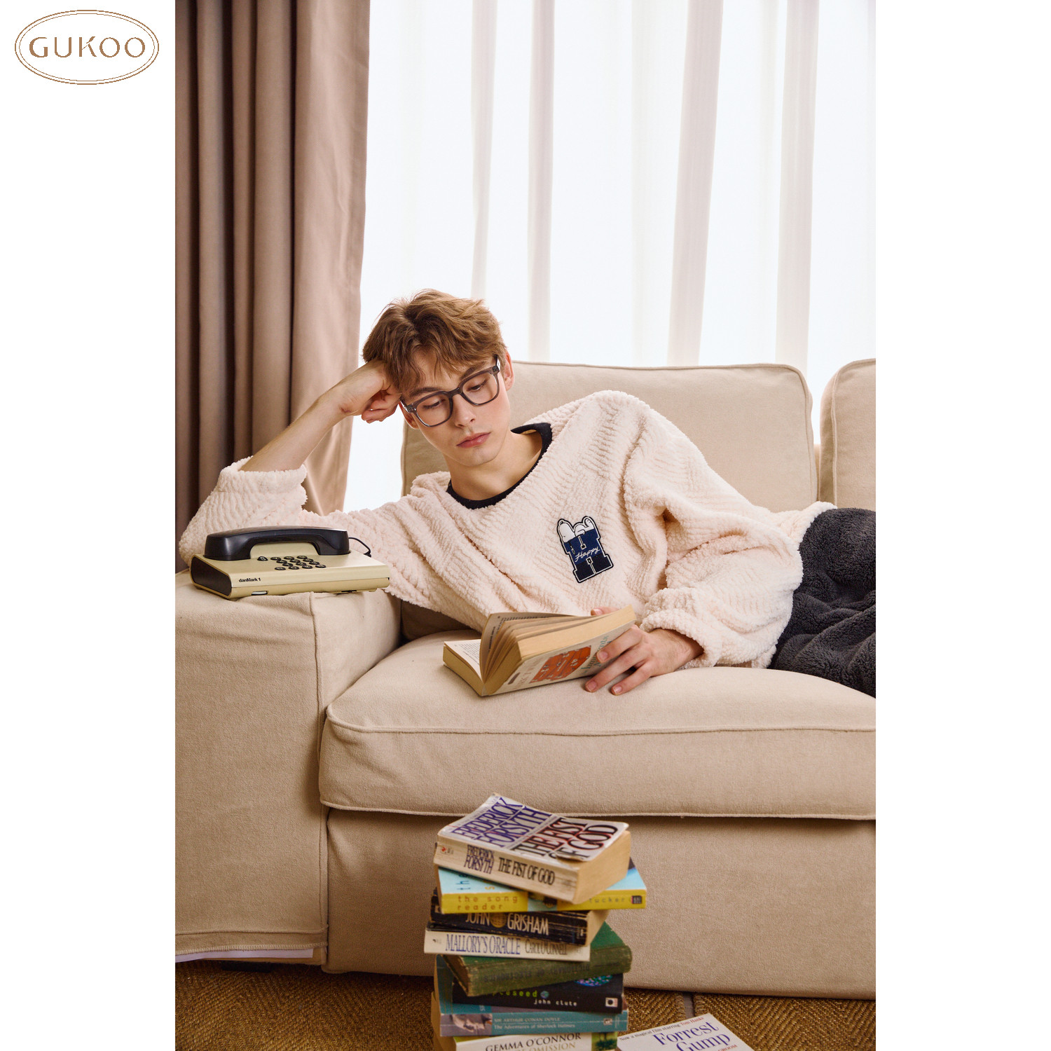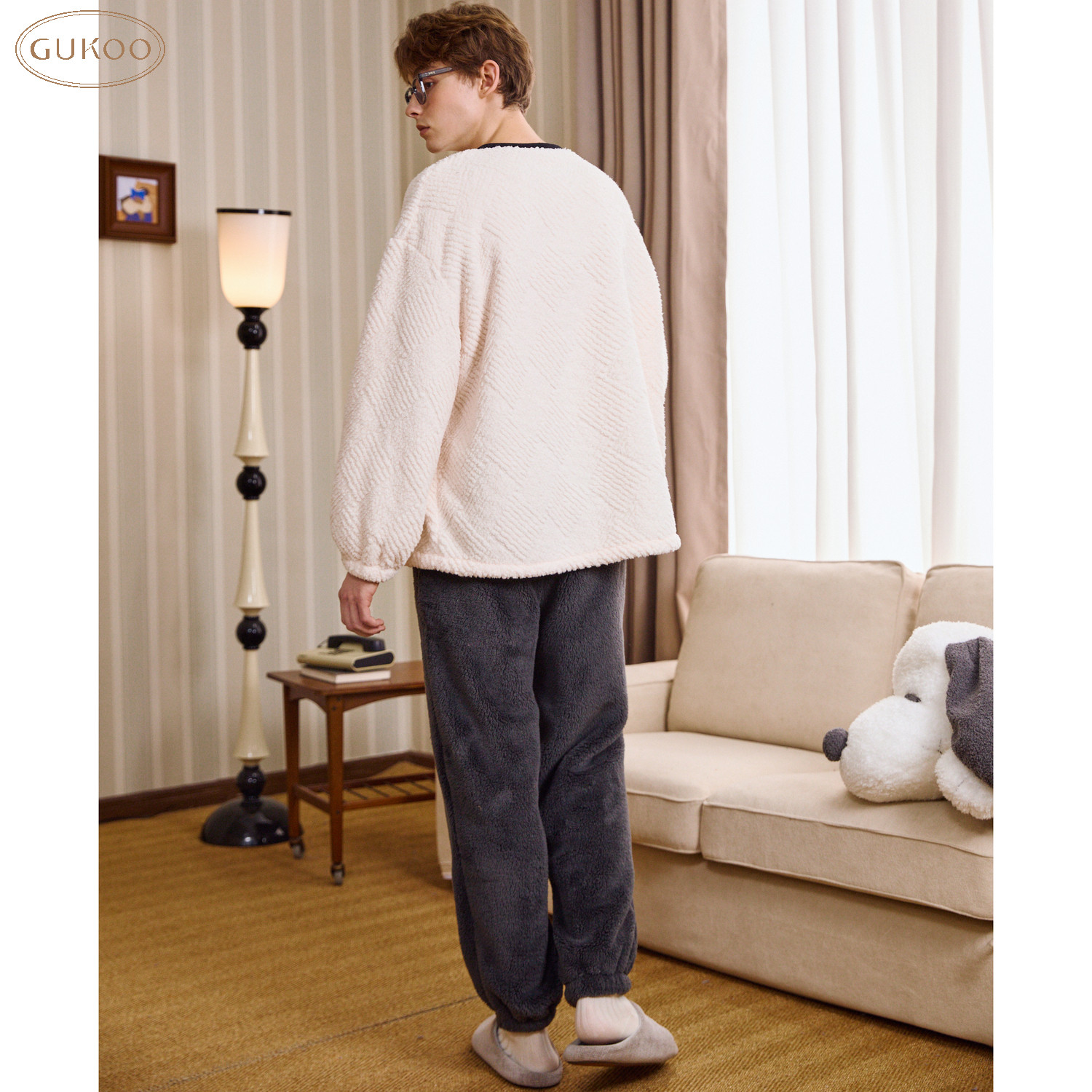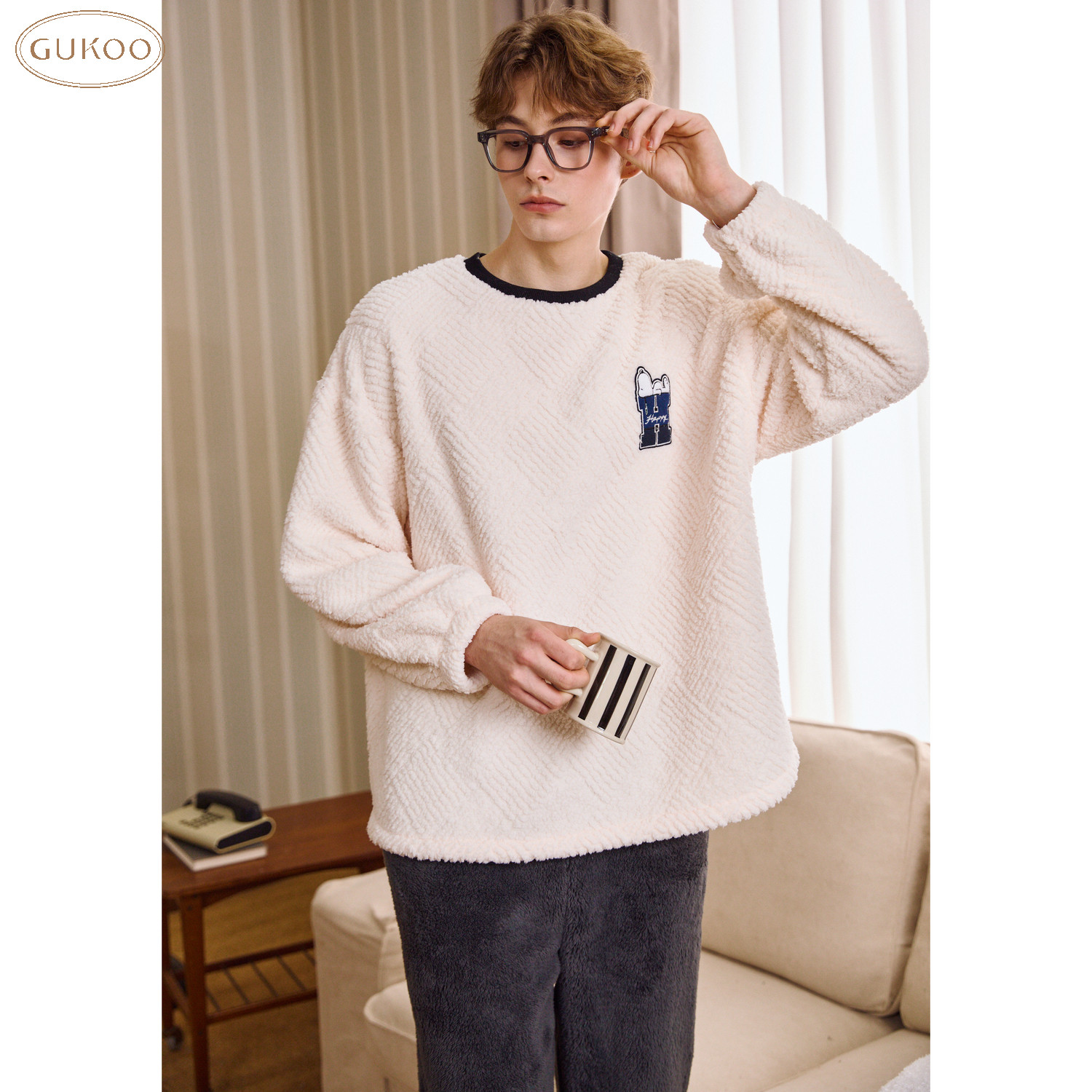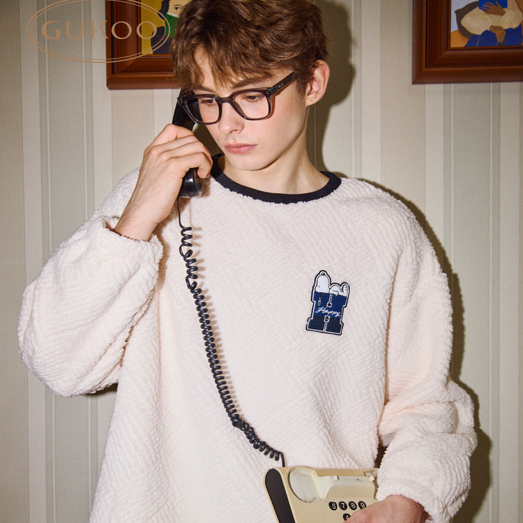 Gukoo/果壳睡衣男冬款史努比系列简约加绒保暖家居服套装