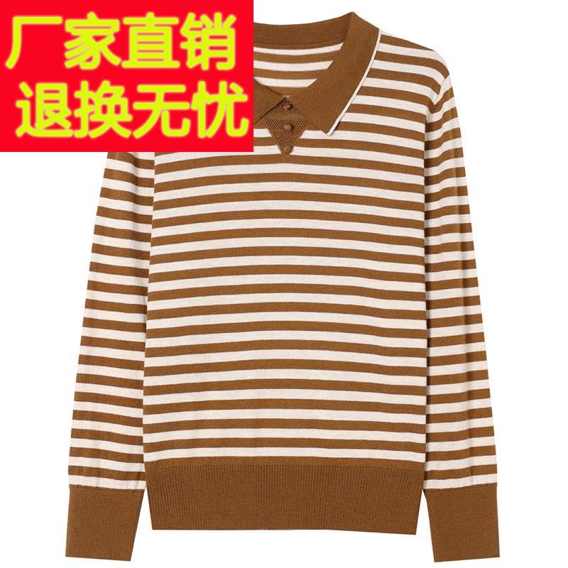 高端桑蚕丝长袖t恤女春秋装妈妈宽松针织打底衫条纹POLO上衣小衫