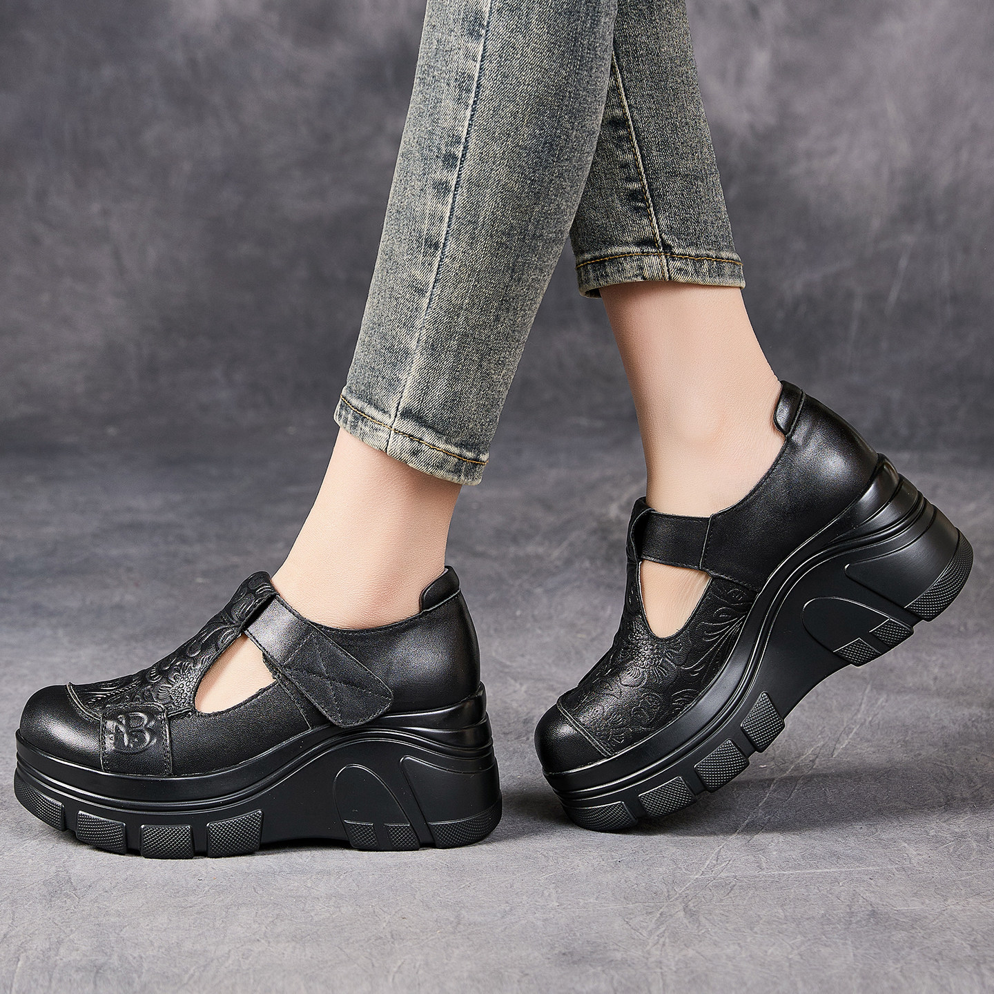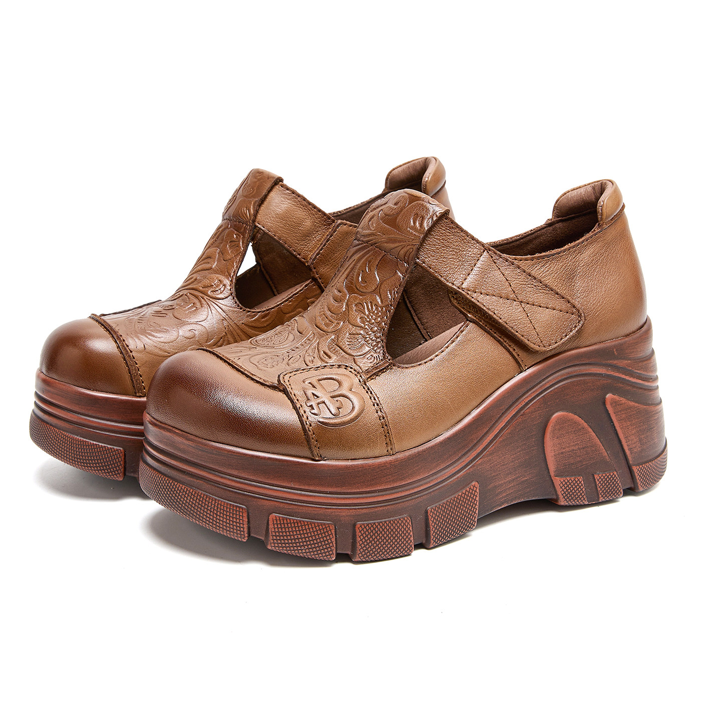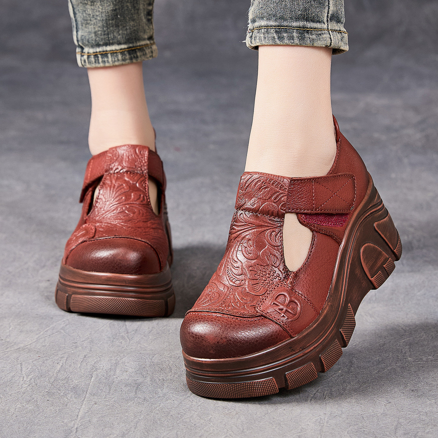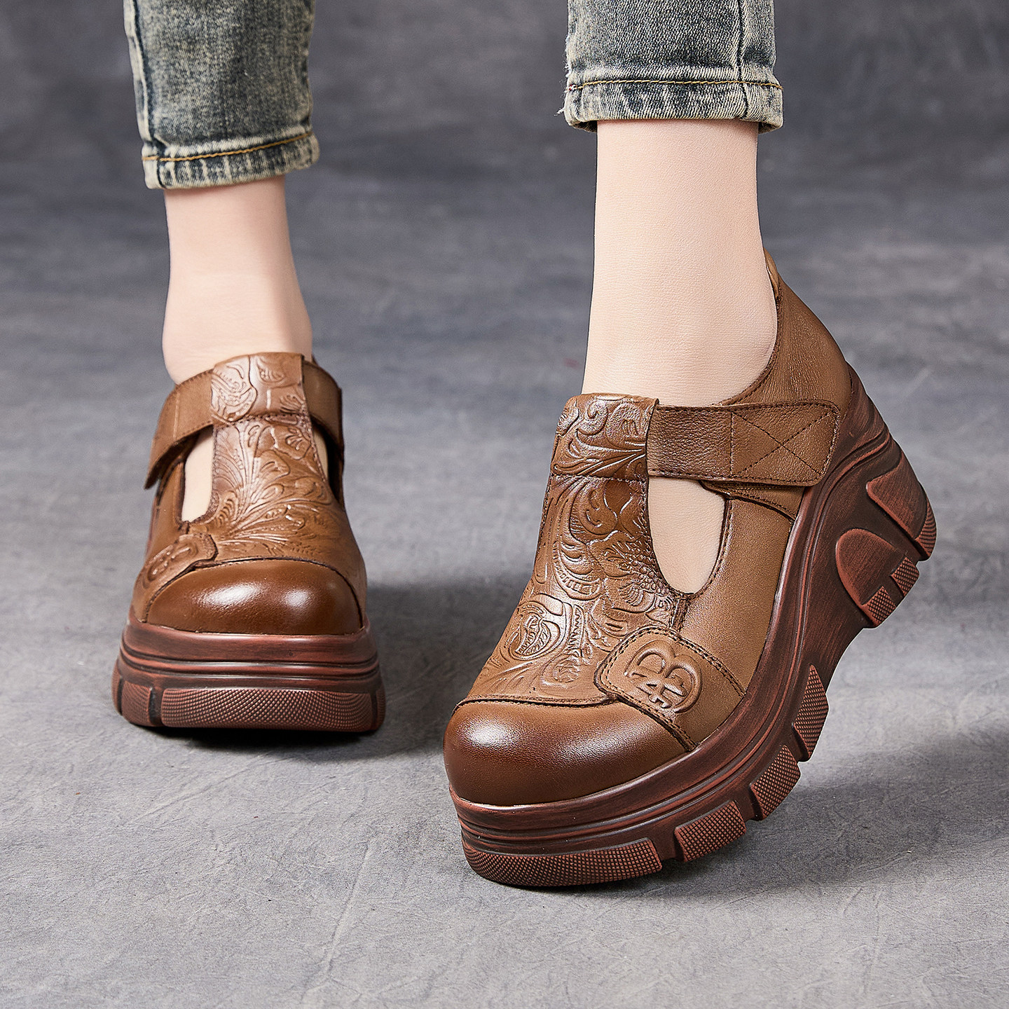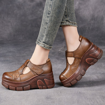 头层牛皮复古印花民族风妈妈鞋2026春新款厚底坡跟丁字真皮女单鞋