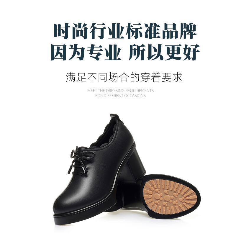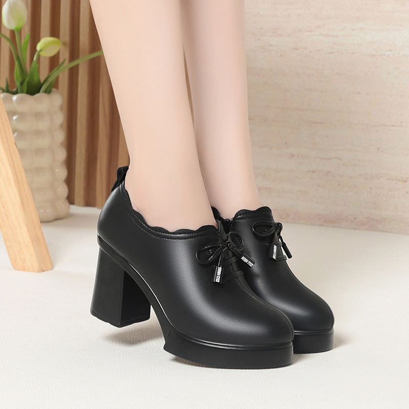 2025女靴冬秋软皮女单鞋深口系带装饰拉链粗跟鞋舒适中老年妈妈中