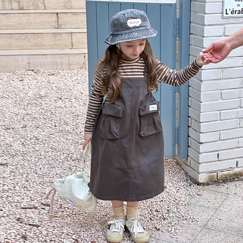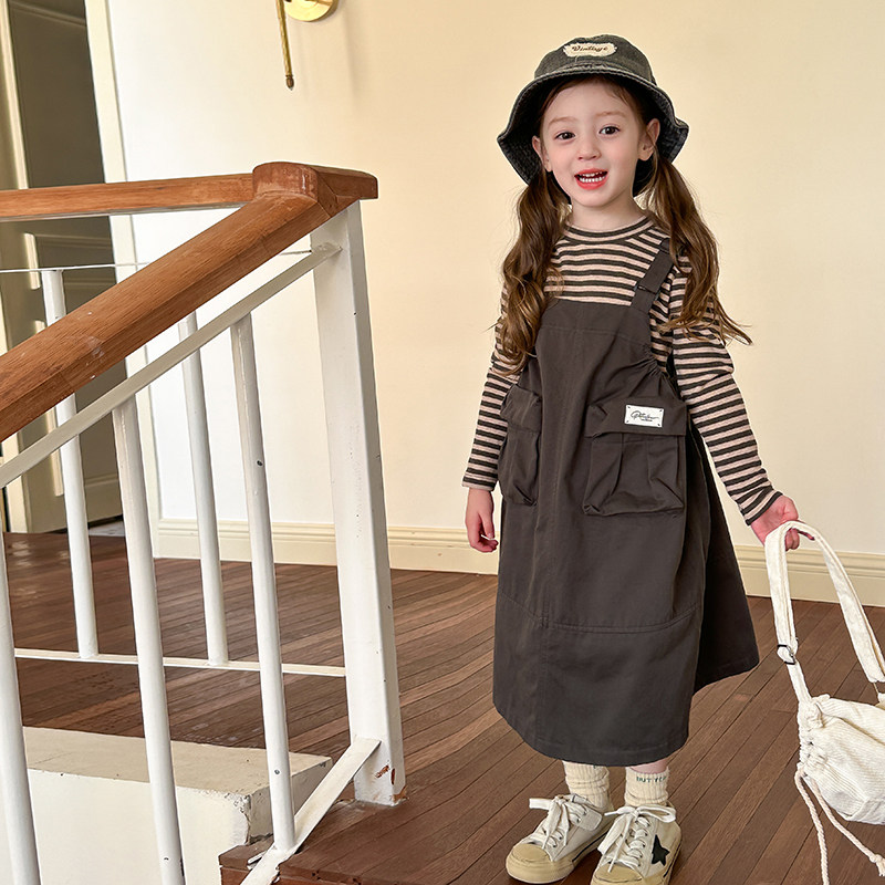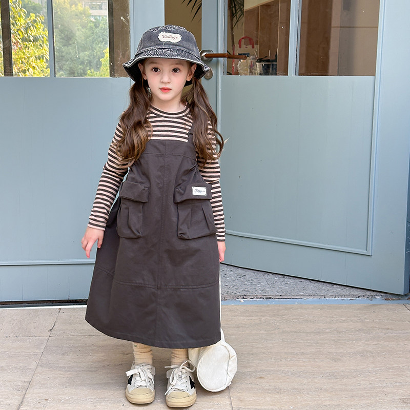 儿童春秋韩版洋气两件套装女童贴标口袋工装风背带裙+条纹打底衫