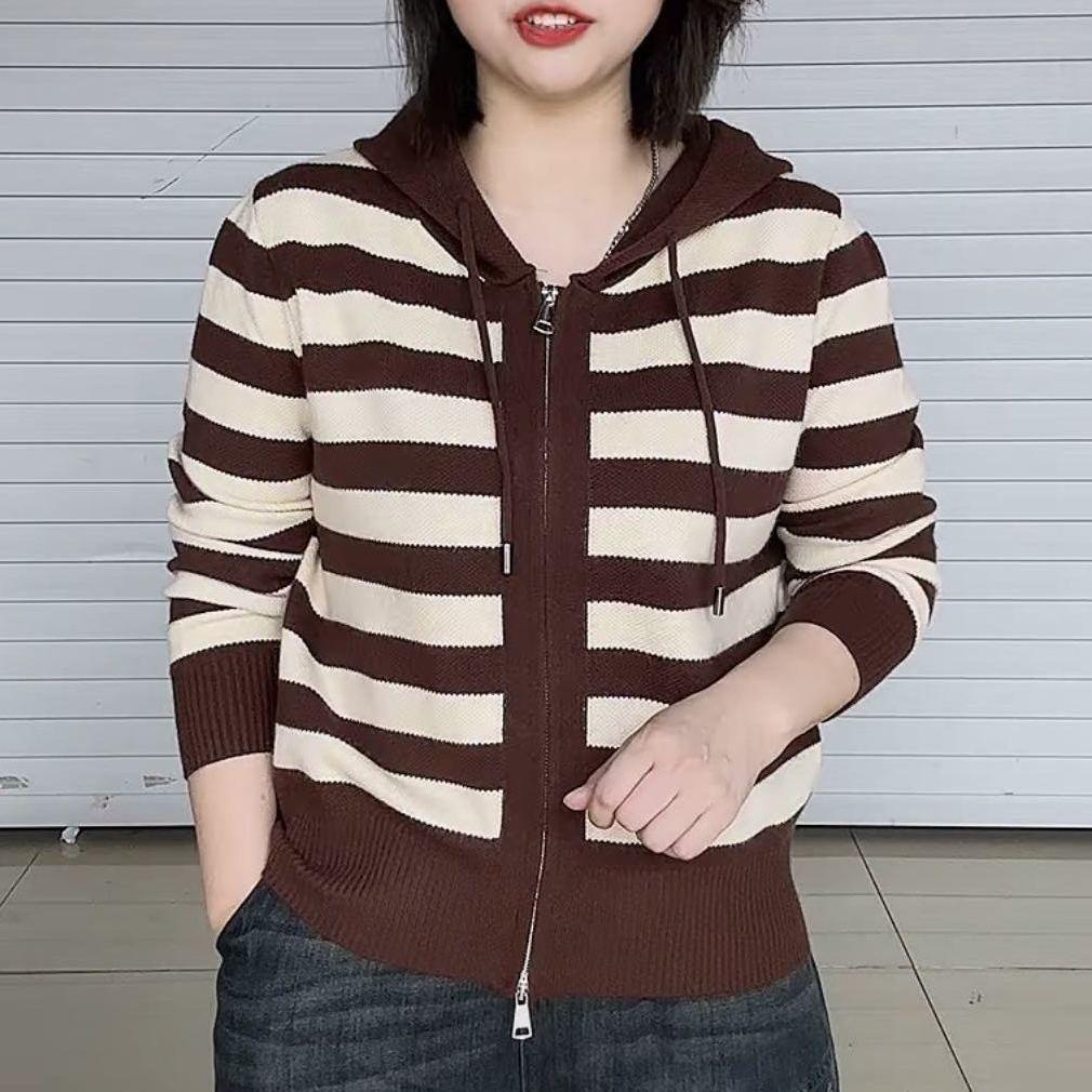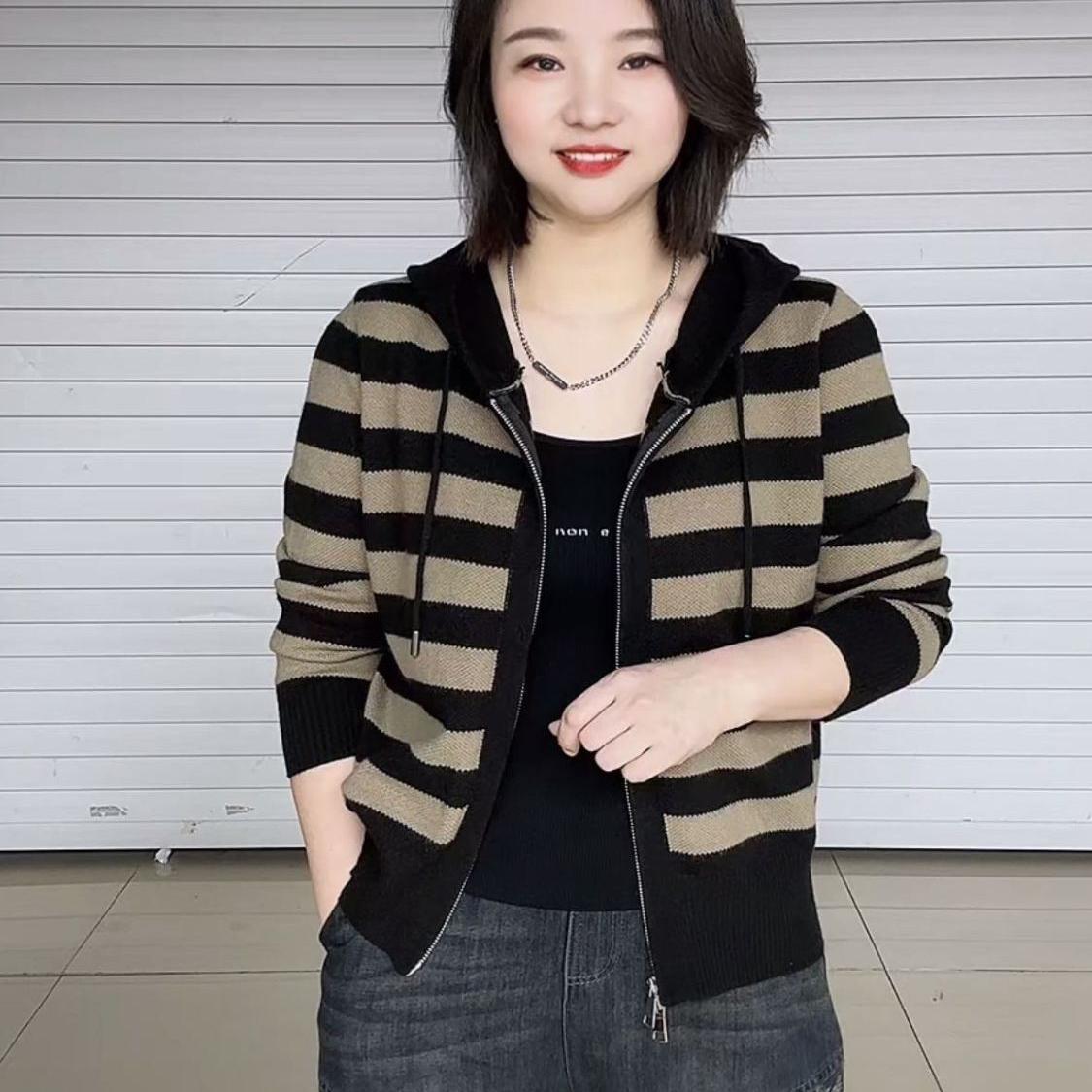 2025秋季新款慵懒风长袖针织开衫拉链外套时尚百搭条纹带帽毛衣女