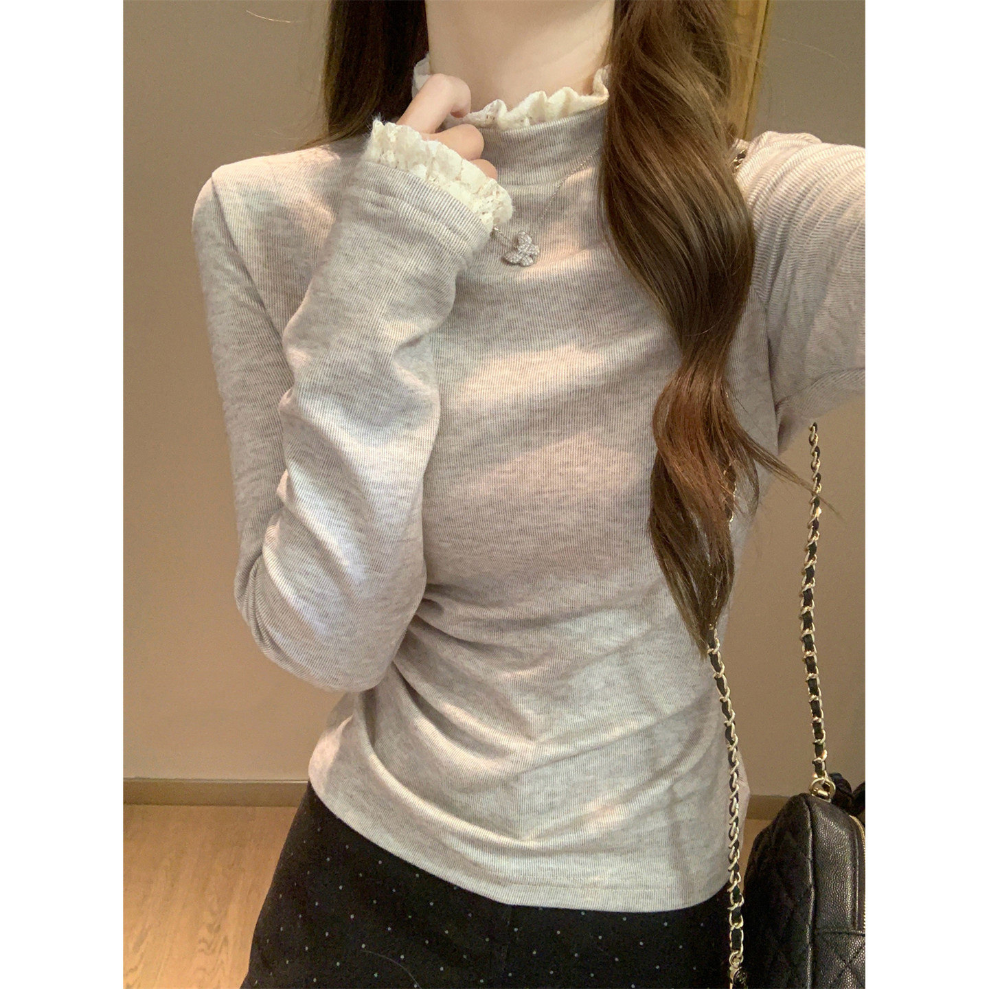 超好看德绒半高领打底衫女内搭秋冬加厚保暖蕾丝修身收腰长袖t恤