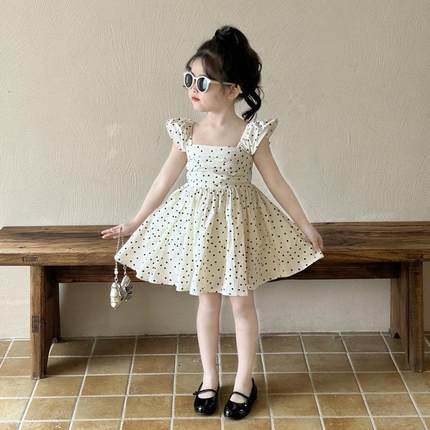 女童波点连衣裙小飞袖背心裙2026夏装女孩露背公主裙宝宝蓬蓬裙子