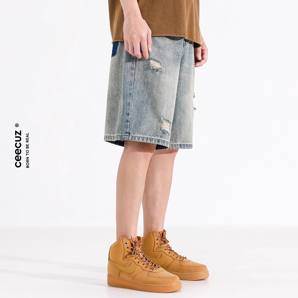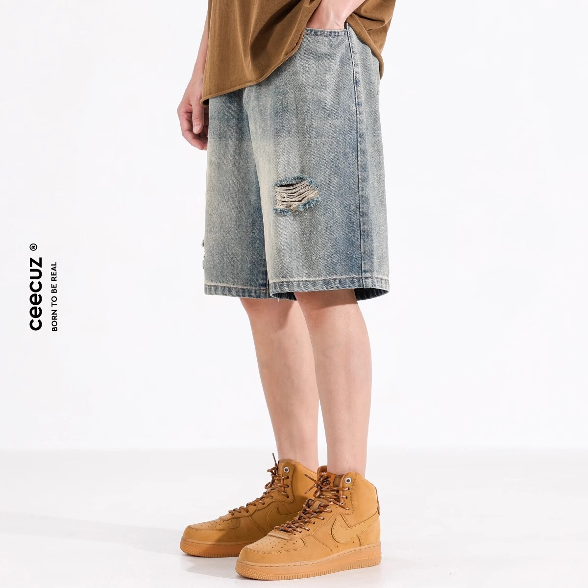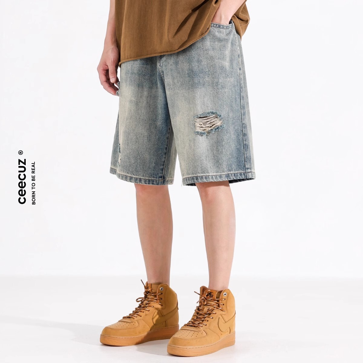 2025新款做旧破洞牛仔短裤夏季新款宽松直筒中裤薄款休闲五分裤男