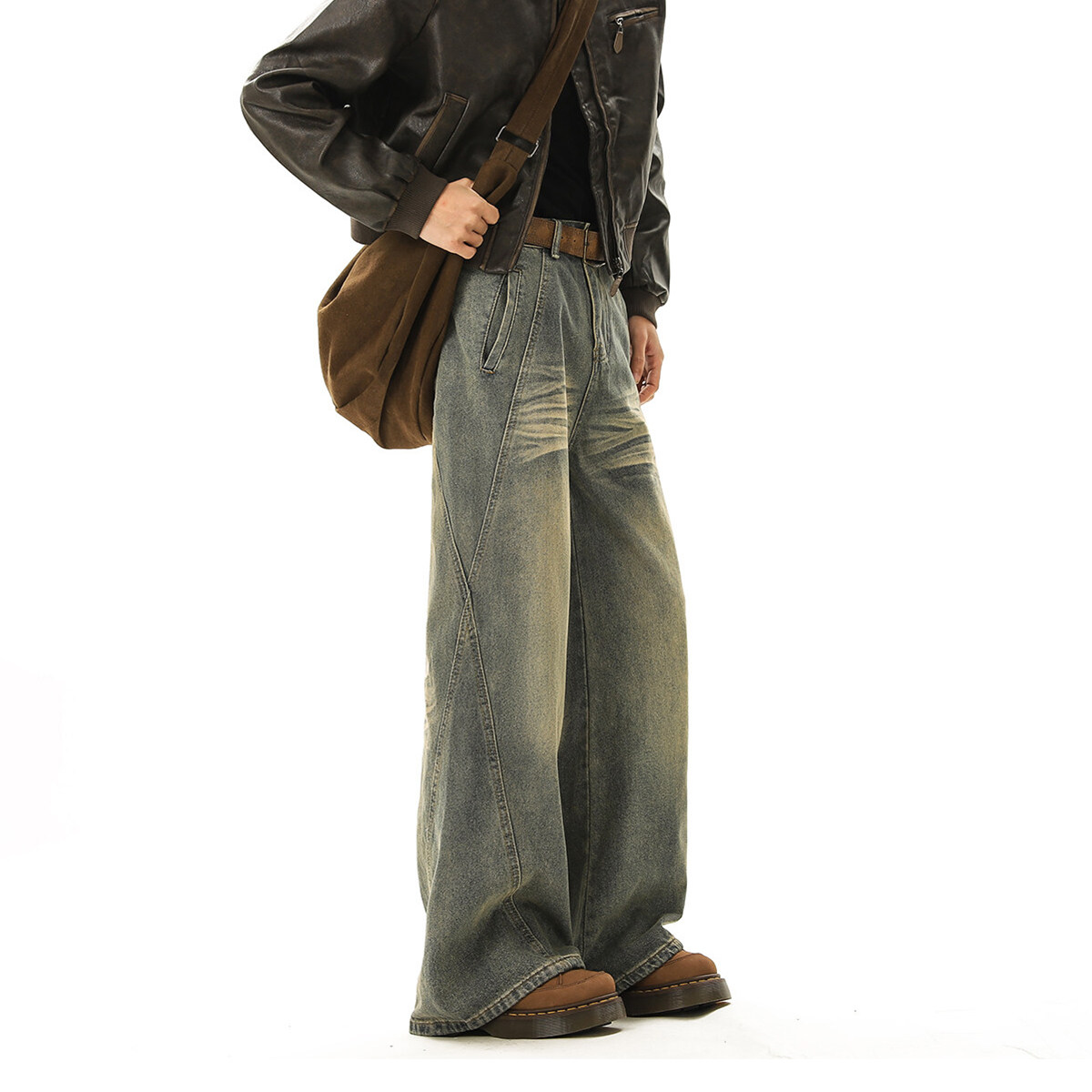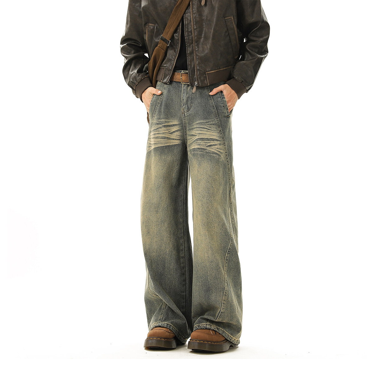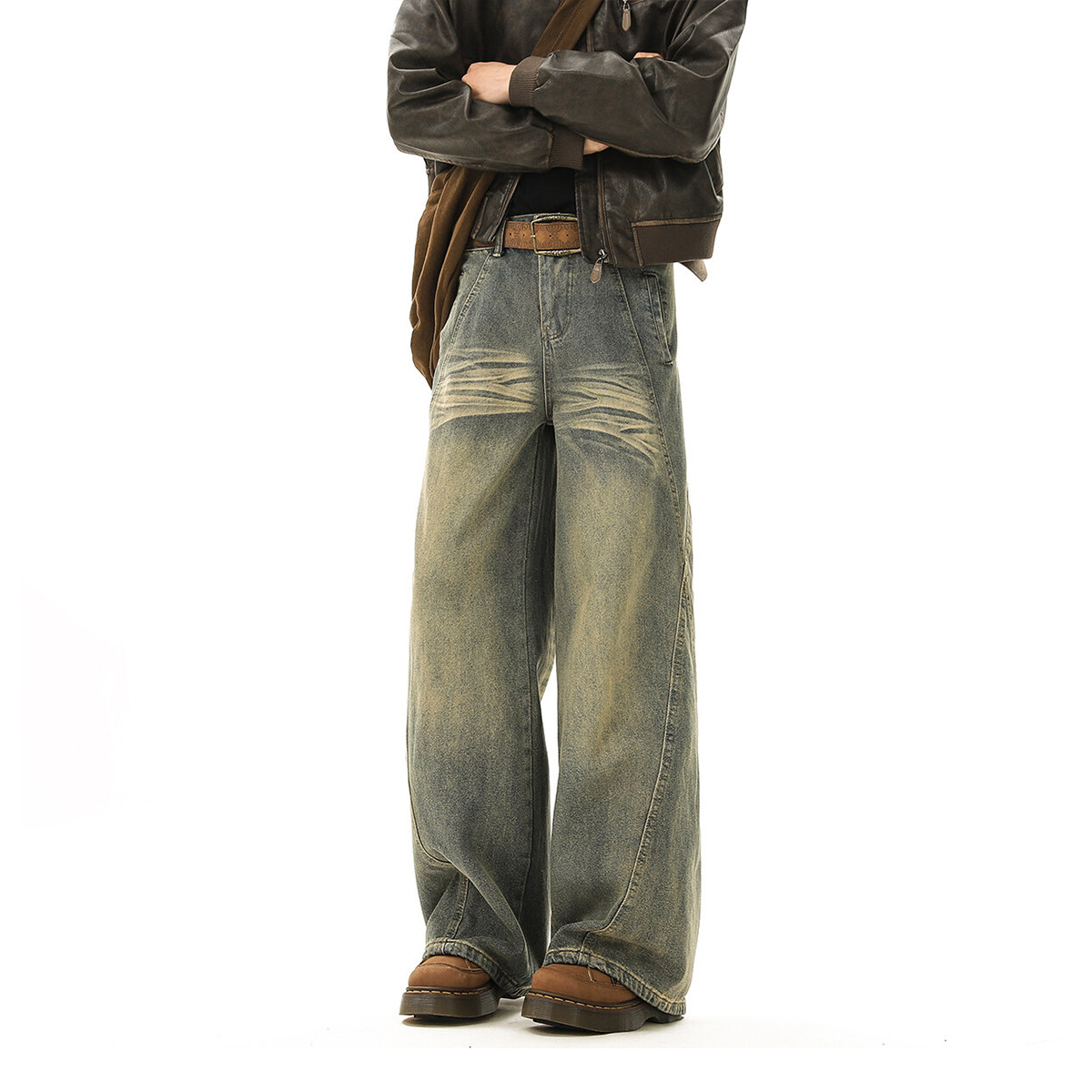 V37美式解构裁剪拼接牛仔裤男款春季高街水洗做旧宽松阔腿长裤子