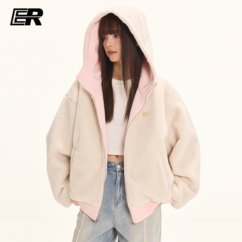 ER双面穿开衫卫衣2025美式潮牌仿羊羔毛棉服外套休闲宽松情侣帽衫