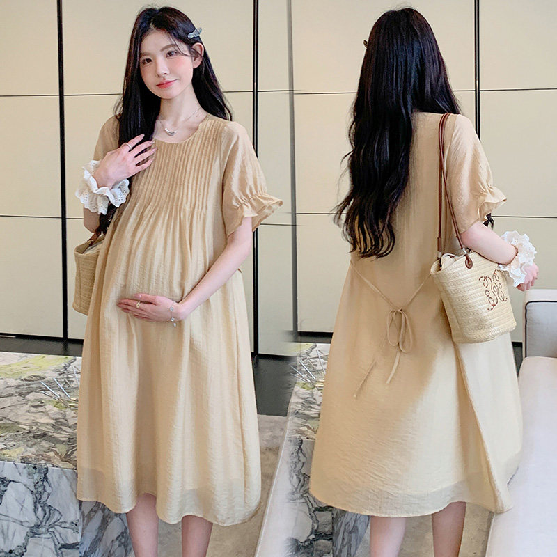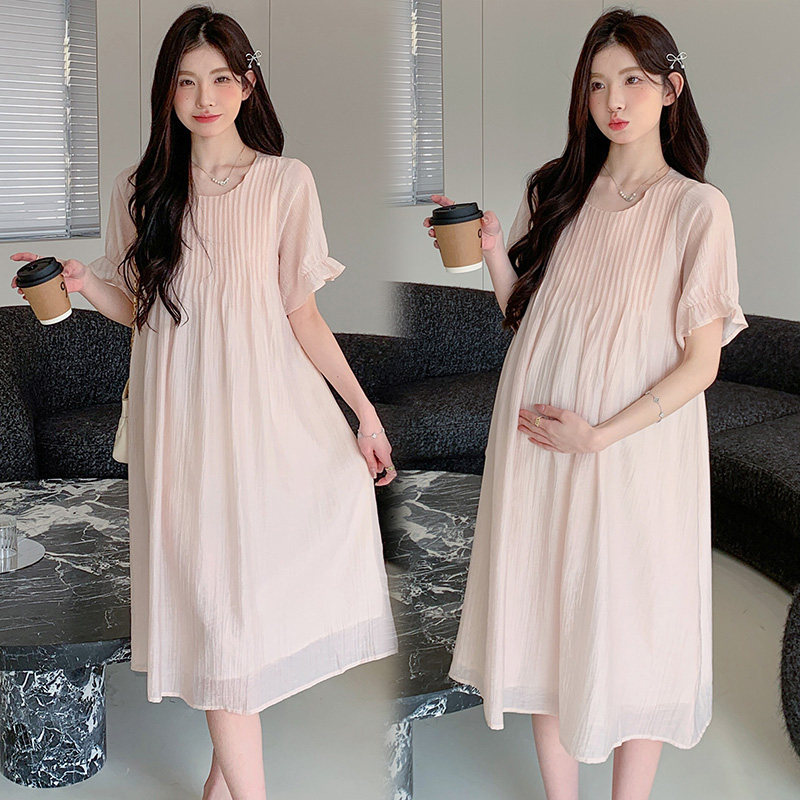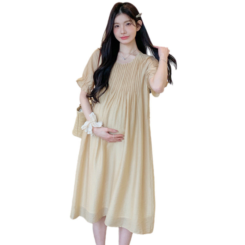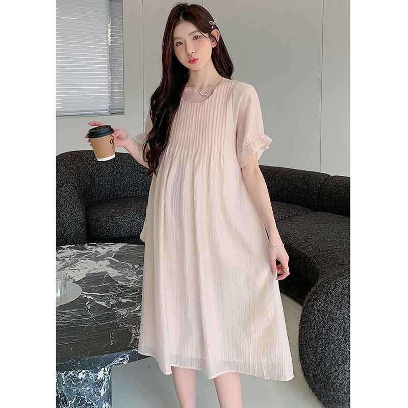 孕妇装夏天连衣裙中长款宽松圆领短袖薄款透气怀孕期时尚洋气裙子