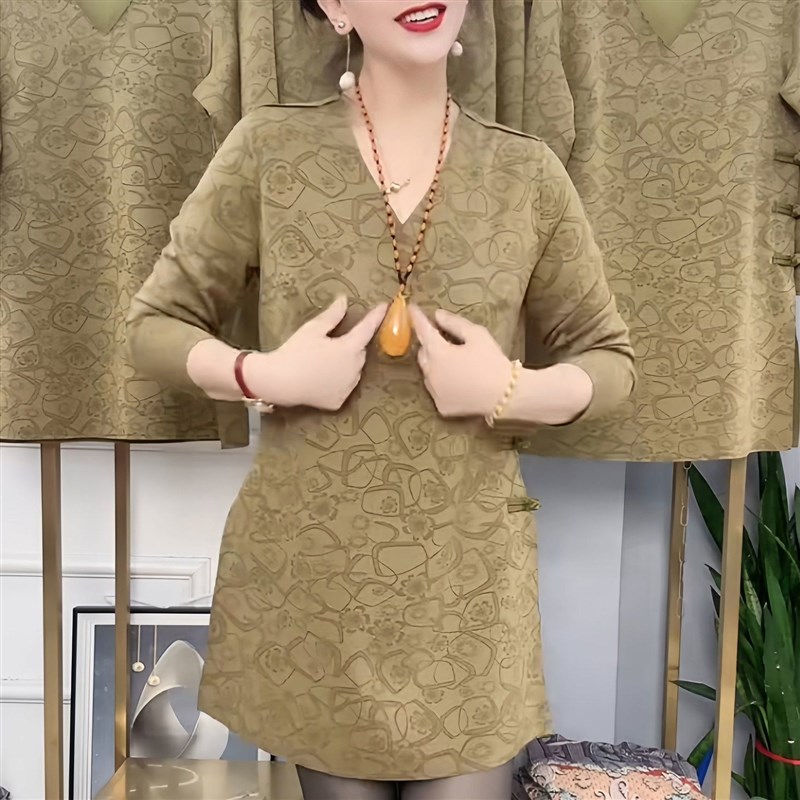 大码v领长袖t恤上衣女秋冬季新款宽松显瘦盘扣百搭中长款打底小衫
