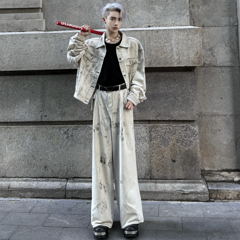 废土脏脏扎染牛仔外套男模穿搭老钱风高级感套装痞帅短款垫肩夹克