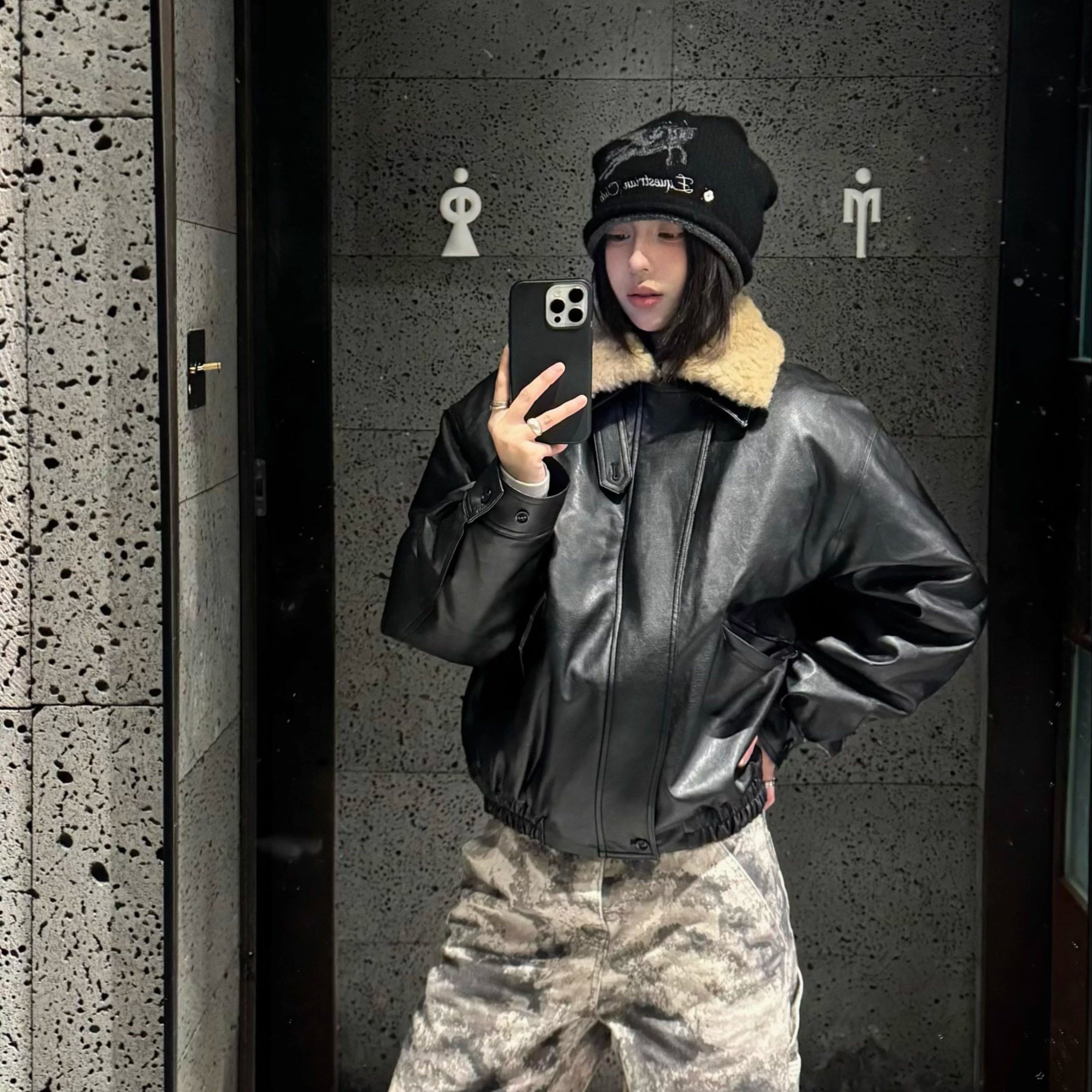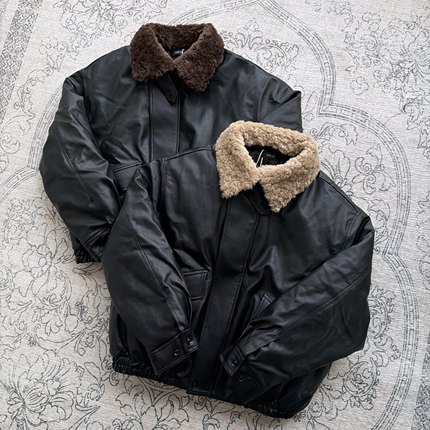 ICE UP可拆卸羊羔毛领新雪丽高填充短宽复古PU皮衣夹克棉服厚外套