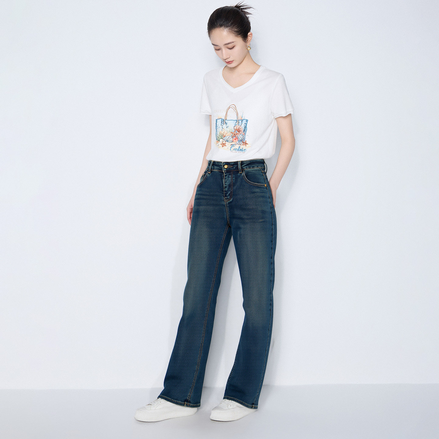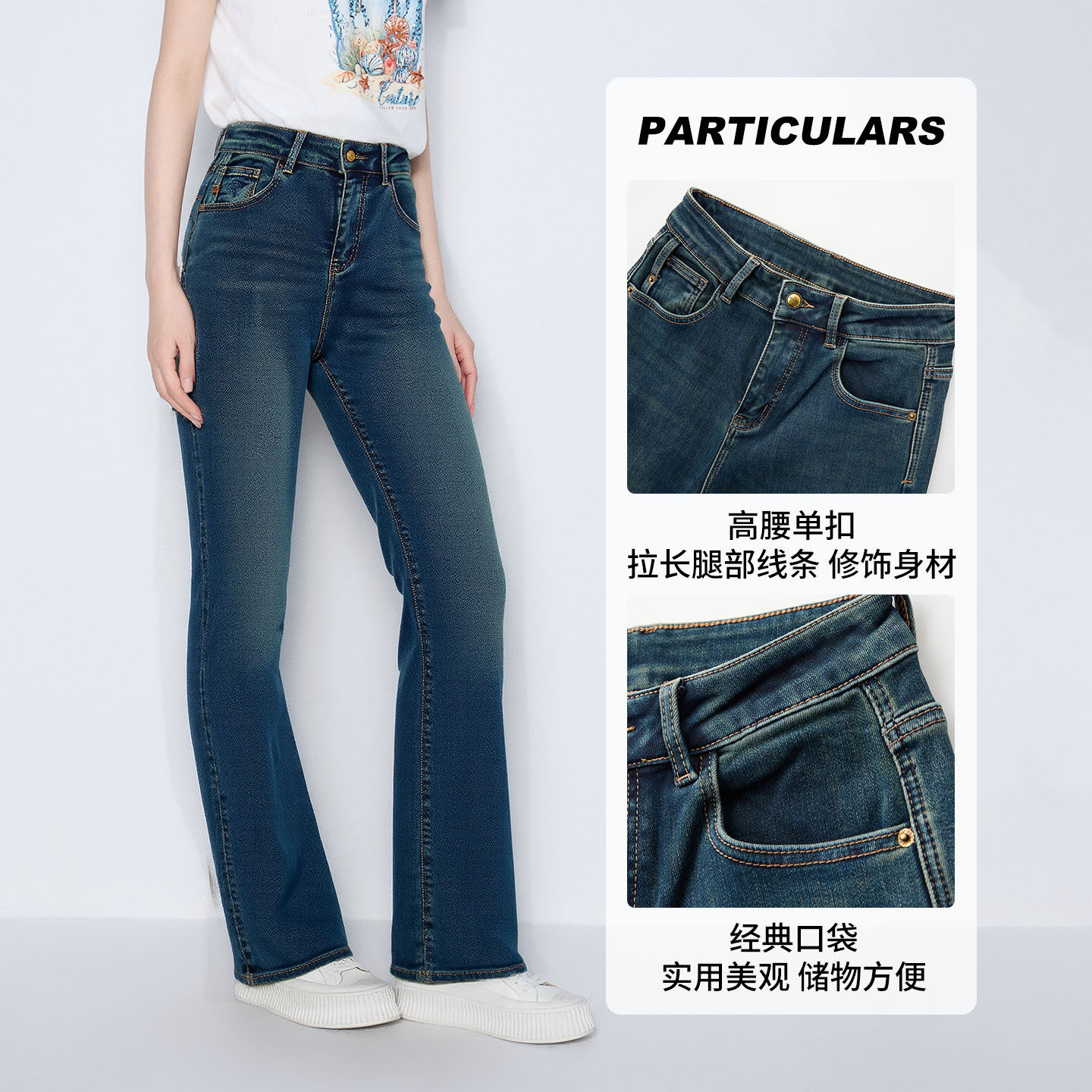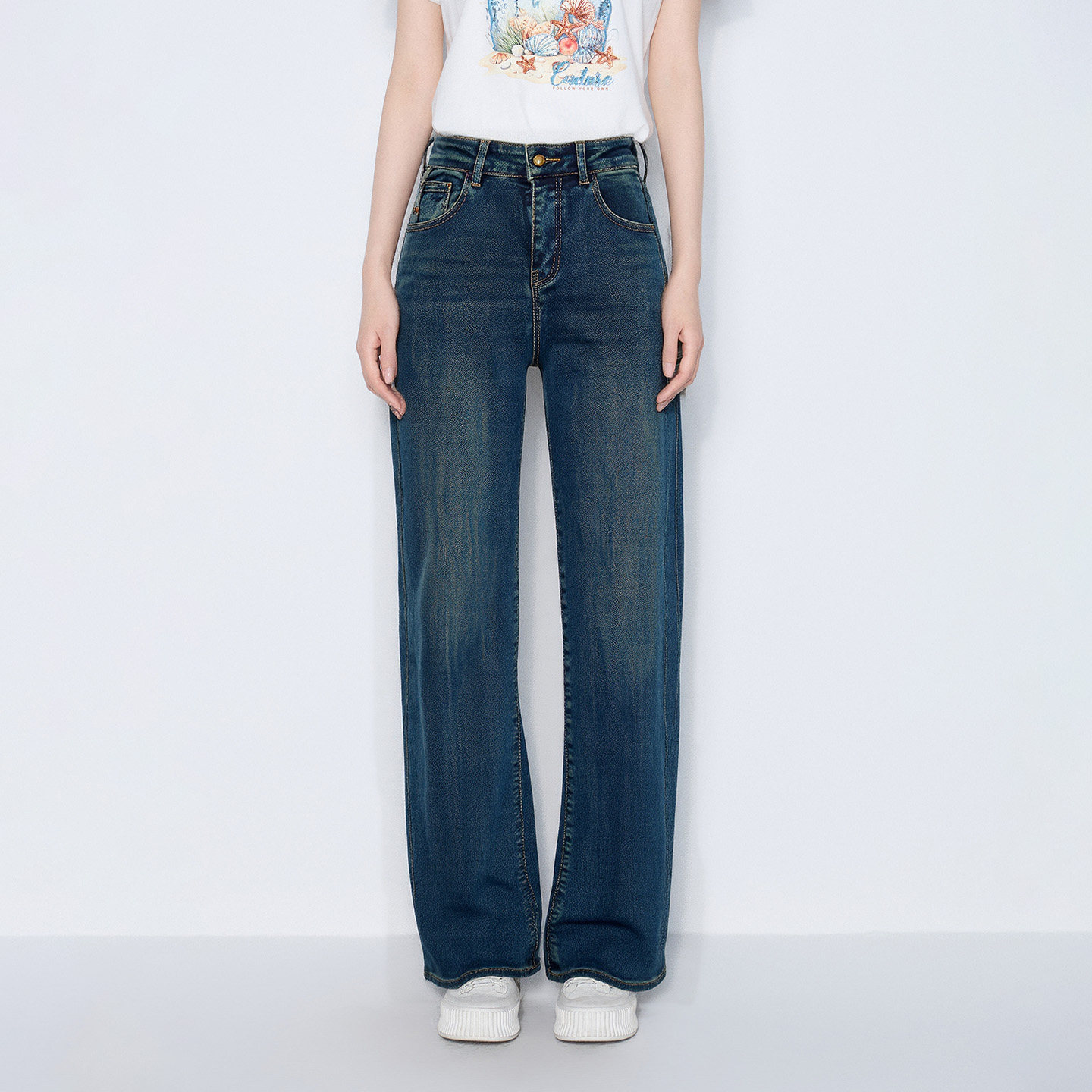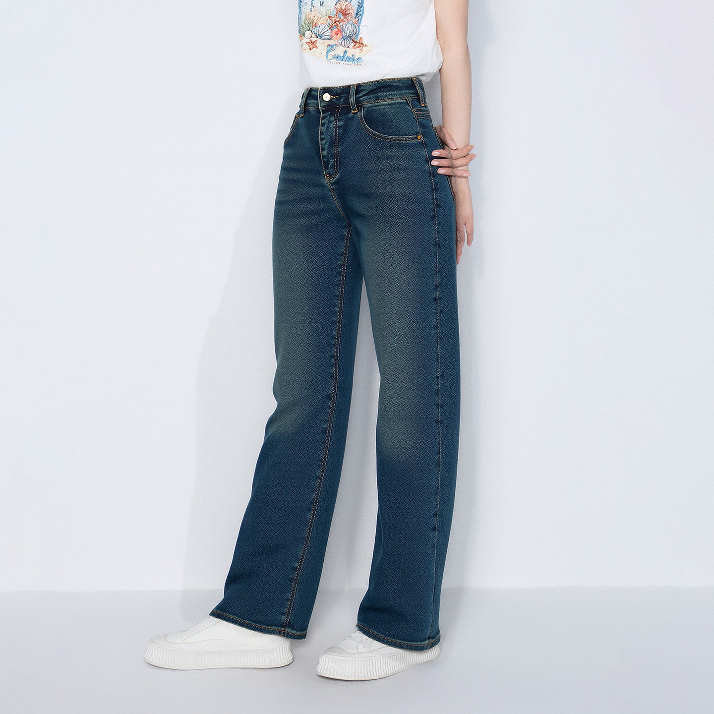 马天奴女装春秋新款蓝色棉质加绒高腰直筒牛仔裤子长裤时尚百搭女
