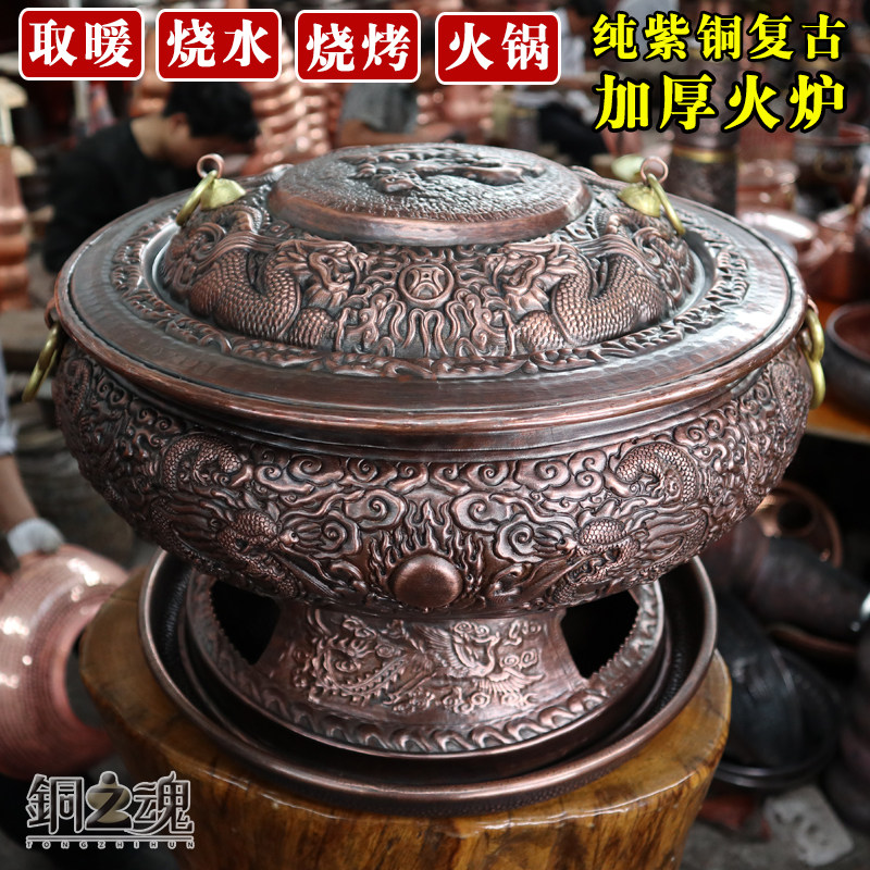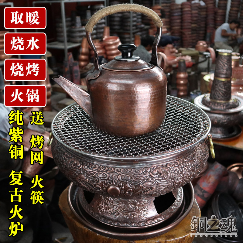 铜火盆老式烤火烧水涮火锅炉木炭烧烤手工纯铜加厚户外取暖器家用