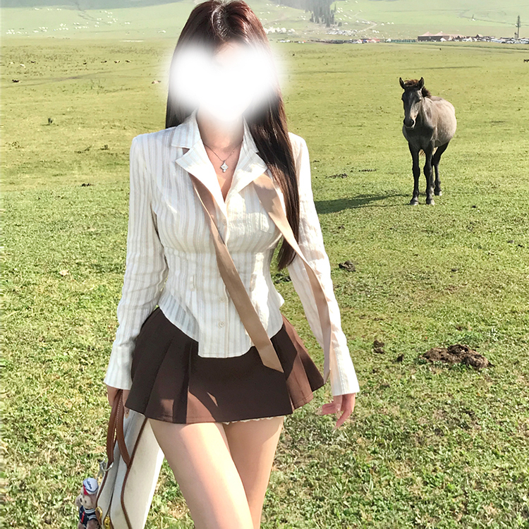 不栀秋意 纯欲气质条纹气质掐腰长袖衬衫上衣+咖色半身裙套装秋季