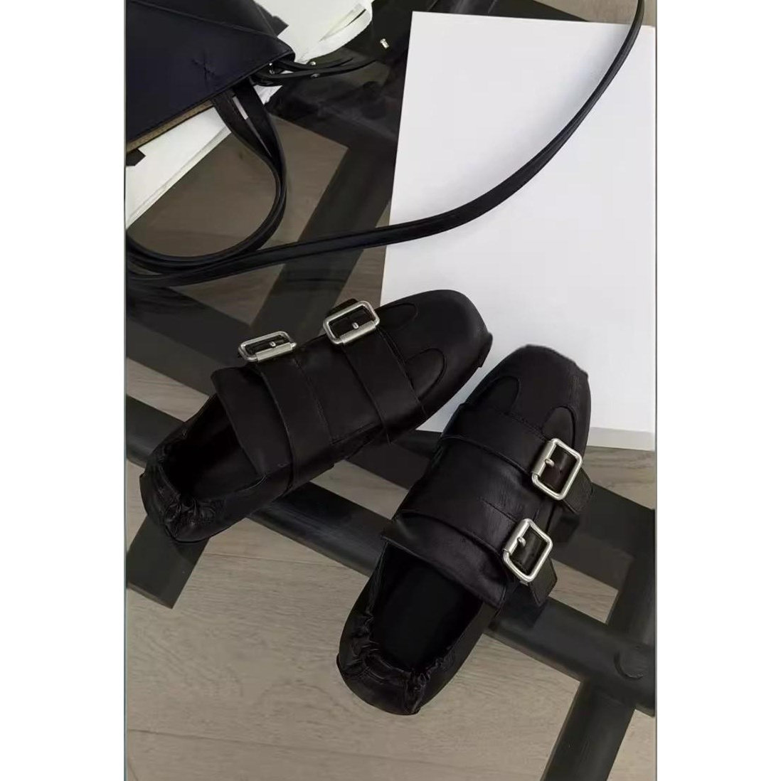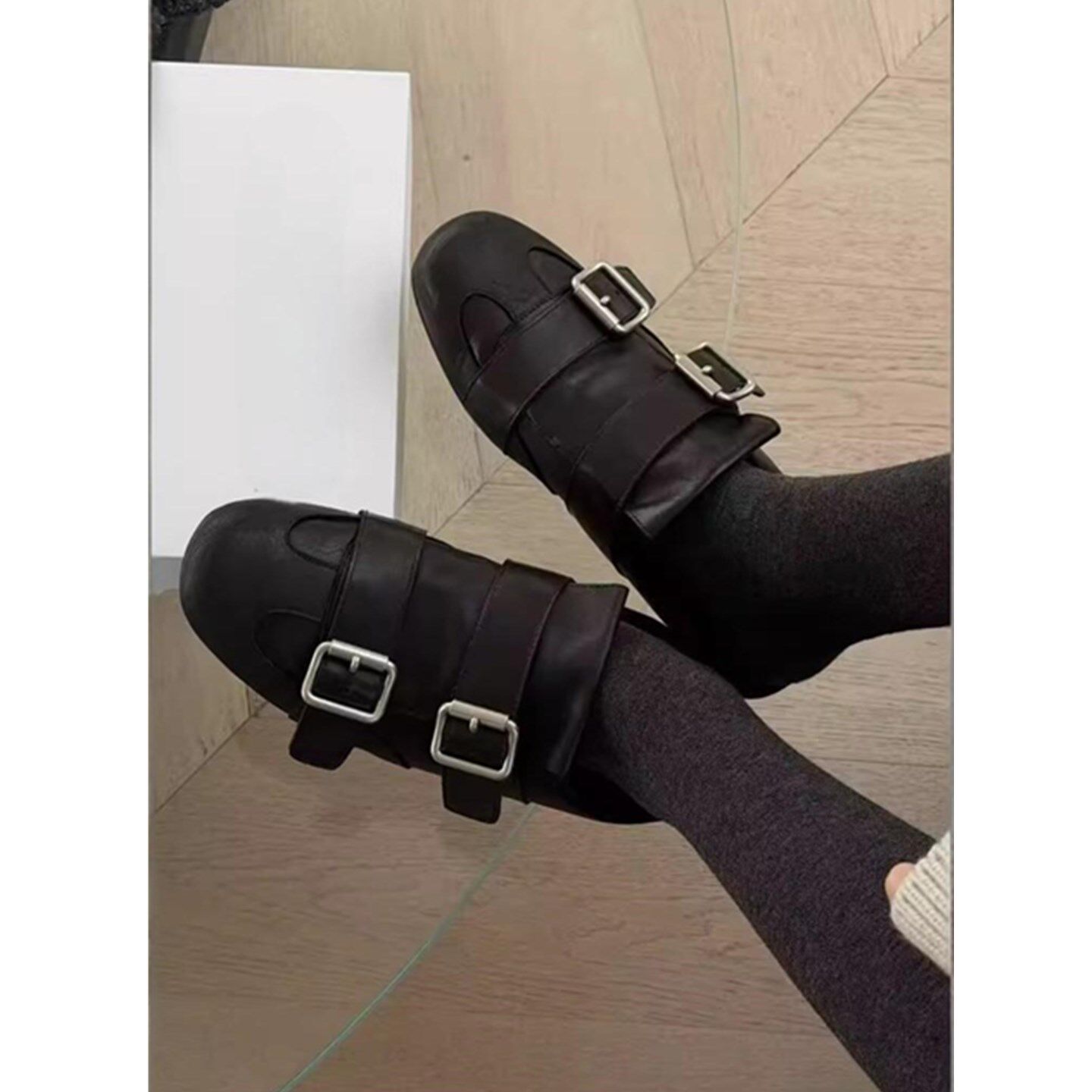欧洲站女鞋2026春季新款真皮英伦风平底圆头搭扣一脚蹬布洛克单鞋