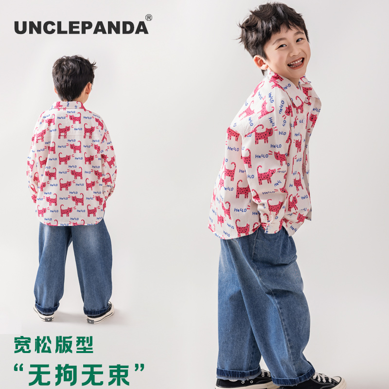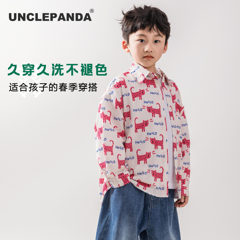 儿童长袖衬衫男童春季小猫满印2025新款中大童时尚百搭潮牌上衣棉