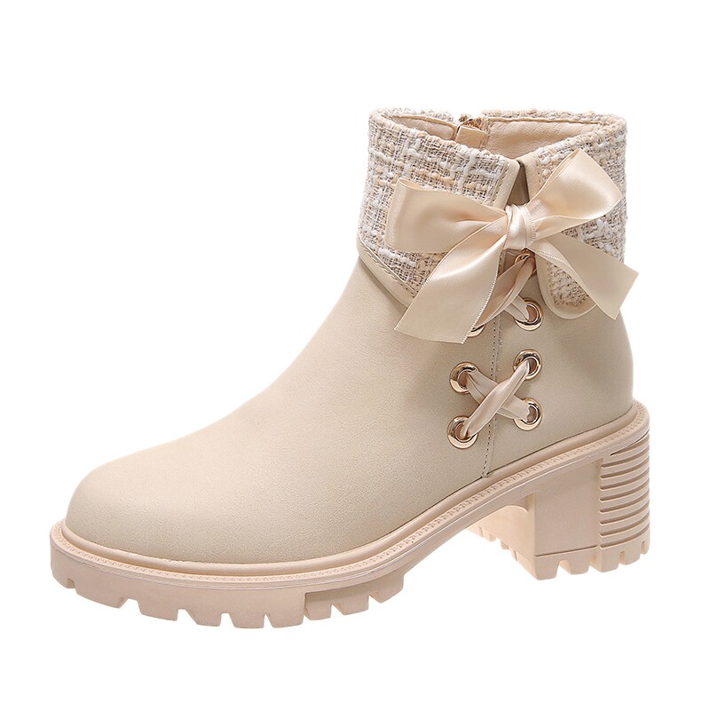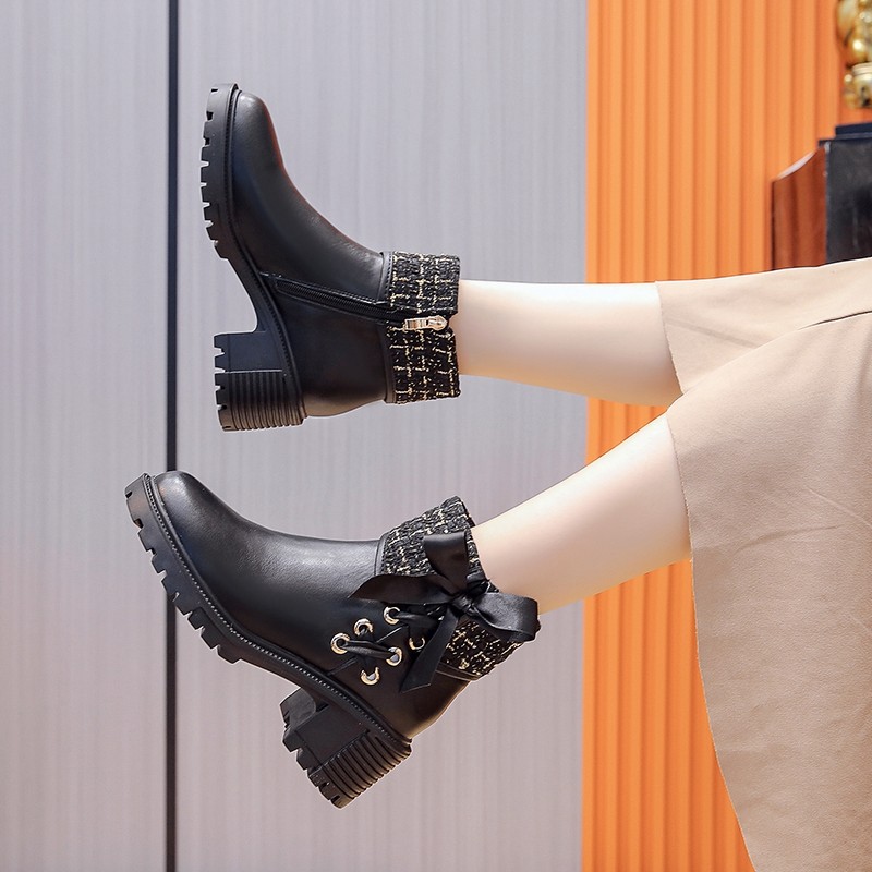 小香风粗高跟短靴女马丁靴2025年新款冬季加绒女靴子百搭春秋单靴