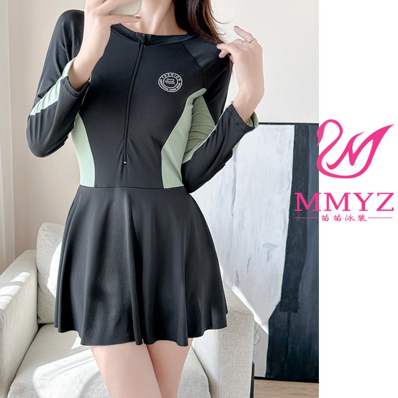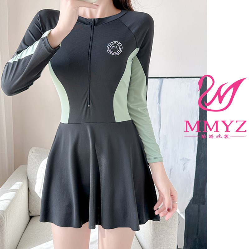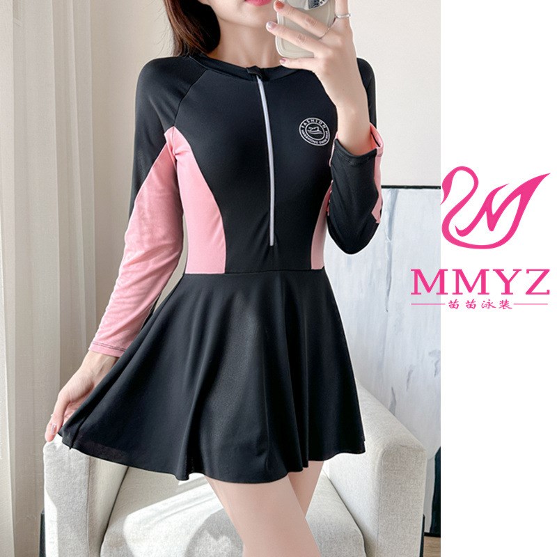 新款温泉游泳衣女连体平角保守显瘦遮肚长袖运动学生高腰大码泳装