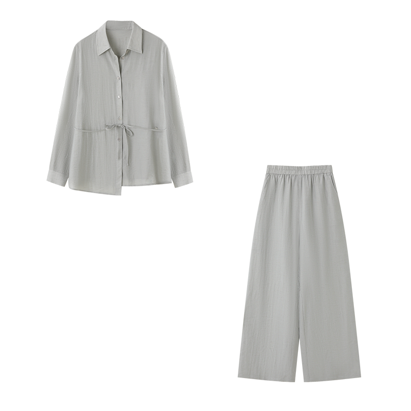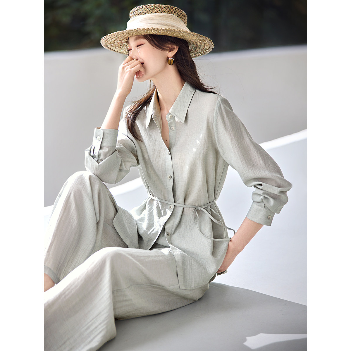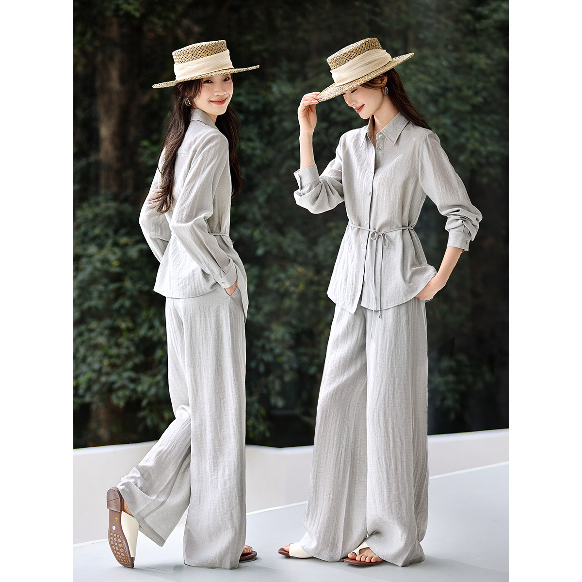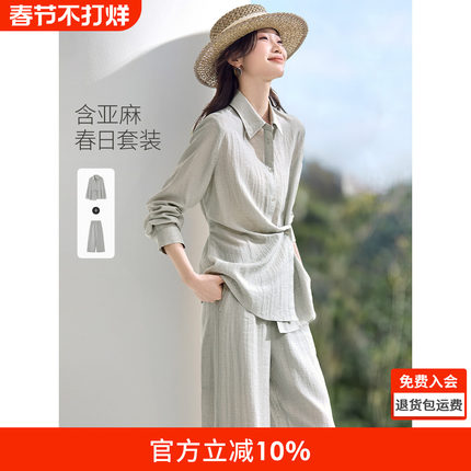 沫晗依美含亚麻两件套26春新款不对称收腰系带V领衬衫直筒裤套装