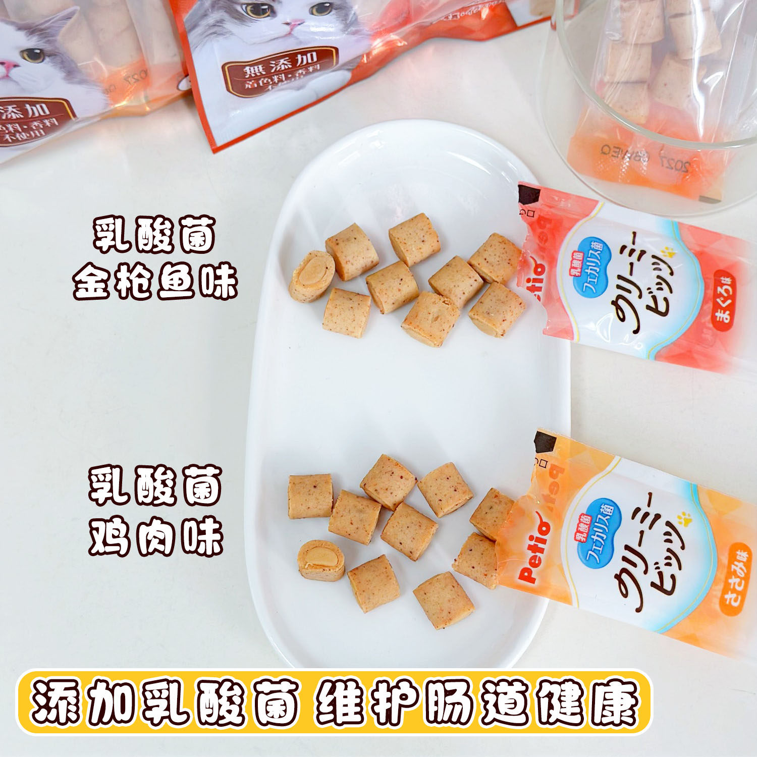 Petio派地奥猫咪零食乳酸菌鸡肉金枪鱼夹心肉粒幼猫成猫辅助喂药