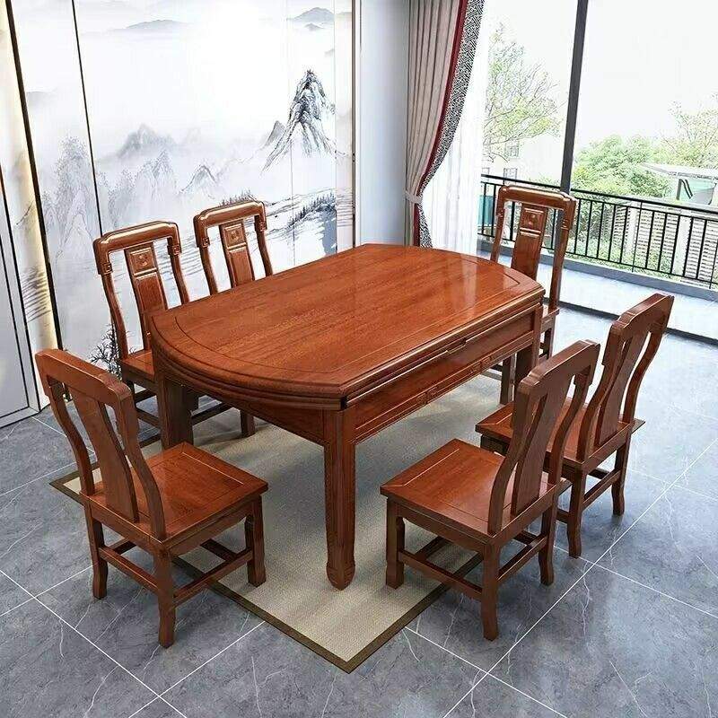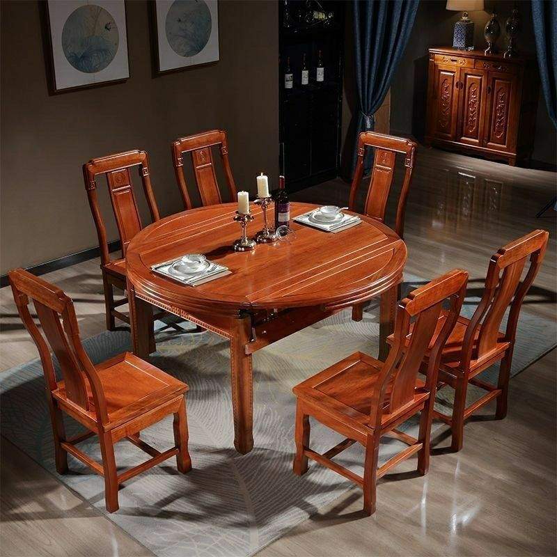 花梨木实木餐桌椅组合伸缩折叠圆形饭桌现代简约家用可变桌子格木