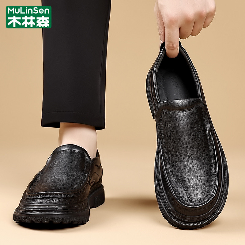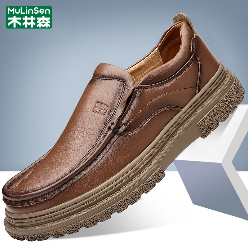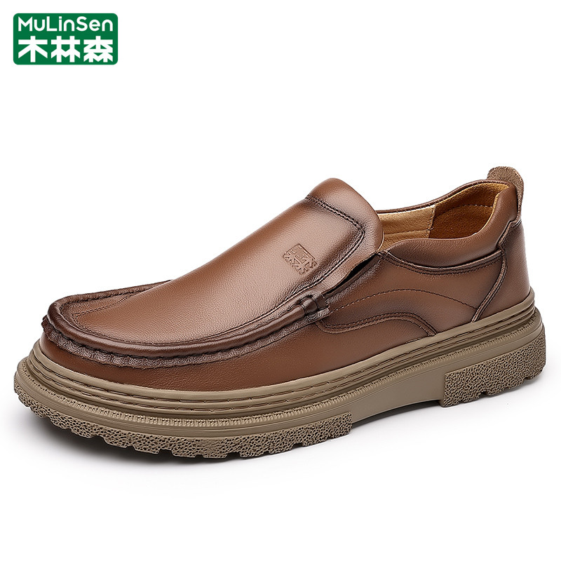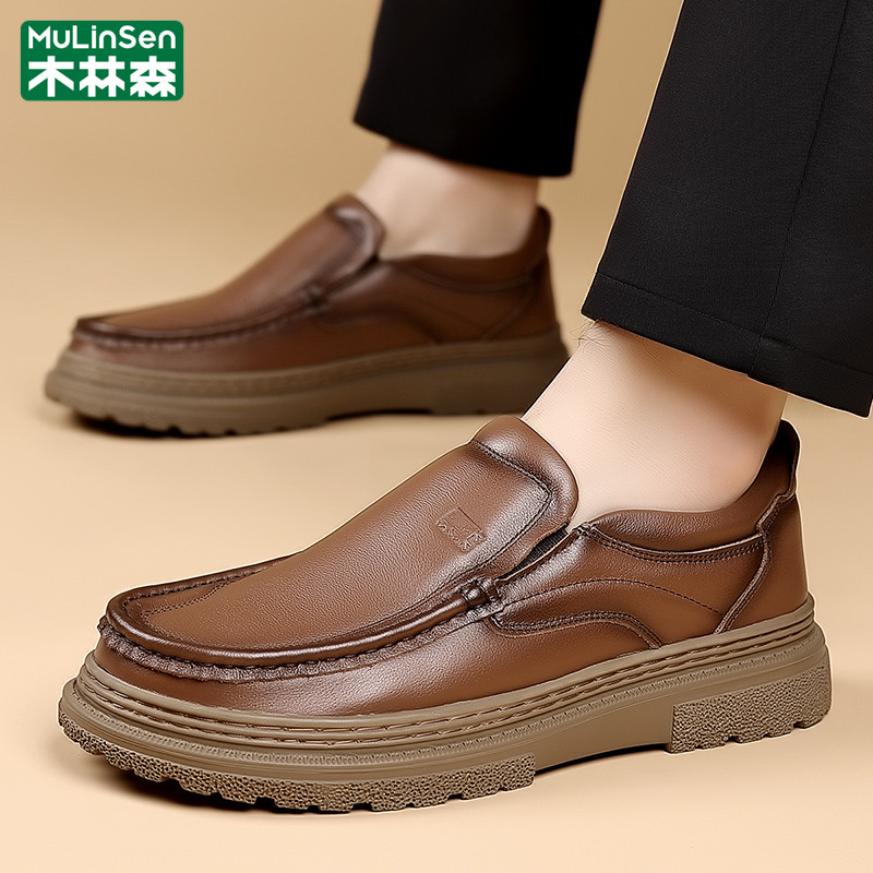 木林森皮鞋男冬季商务休闲头层牛皮一脚蹬棕色驾车乐福豆豆爸爸鞋