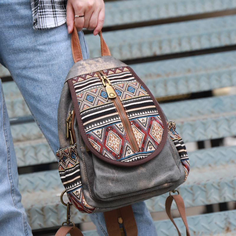 复古刺绣小号背包牛仔时尚胸包百搭撞色翻盖包帆布多层休闲双肩包