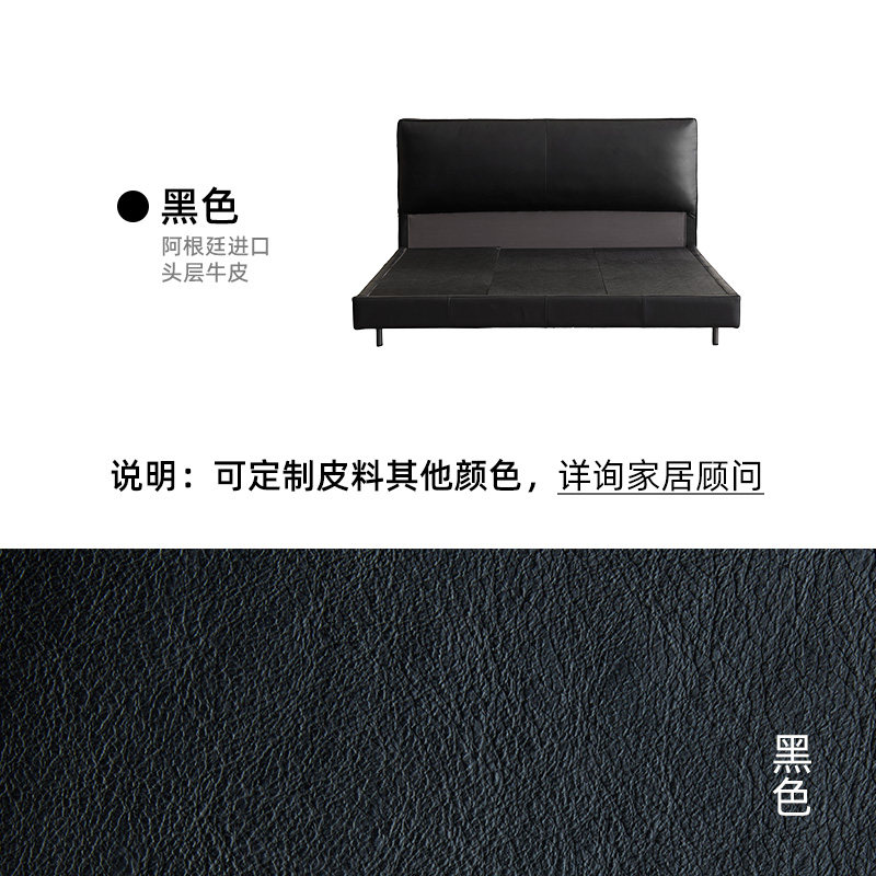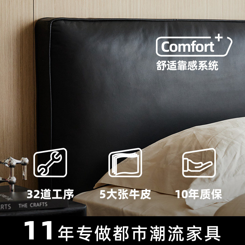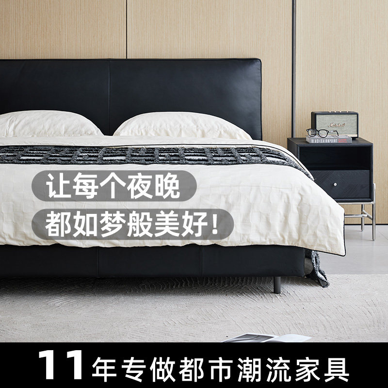 轻奢现代真皮床卧室齐边双人婚床意式极简头层牛皮大黑牛软包皮床