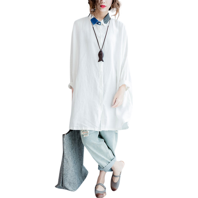 大码女装胖mm春季新款亚麻衬衫中长款宽松文艺拼色领棉麻长袖衬衣