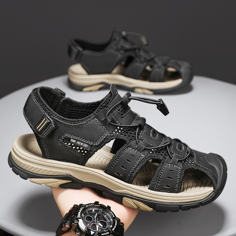 包头牛皮男鞋2025夏季新款真皮防滑沙滩鞋子户外登山休闲洞洞凉鞋