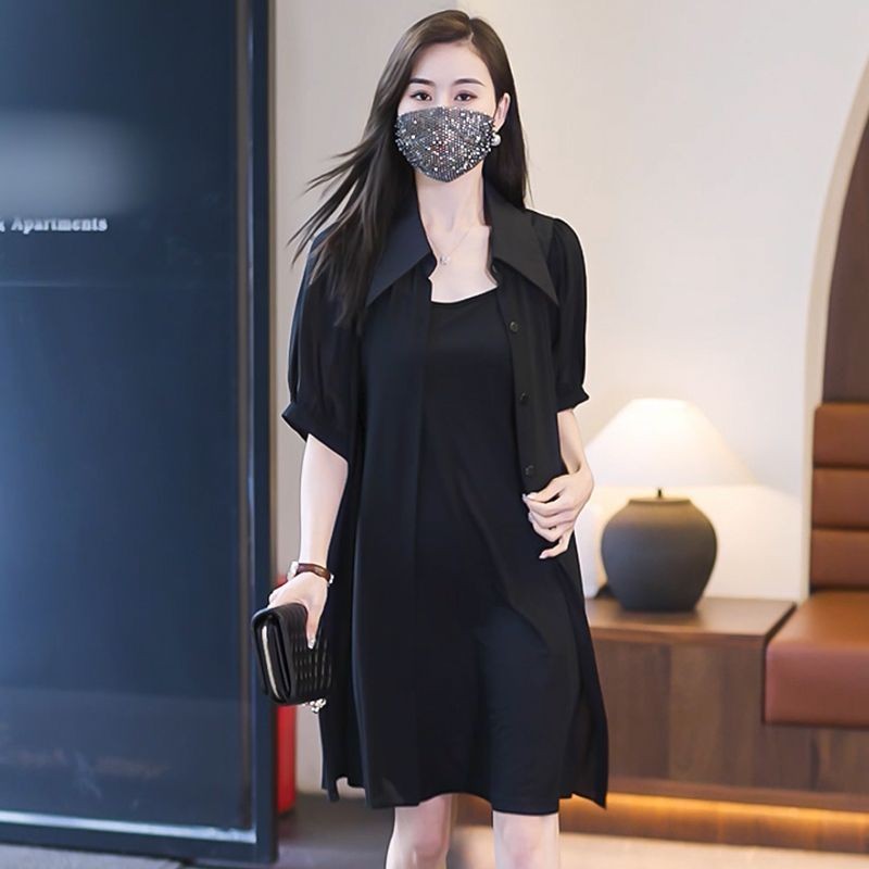 高级感黑色中长款雪纺衬衫连衣裙套装大码女装显瘦吊带裙两件套女