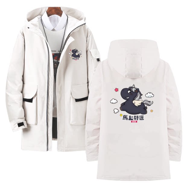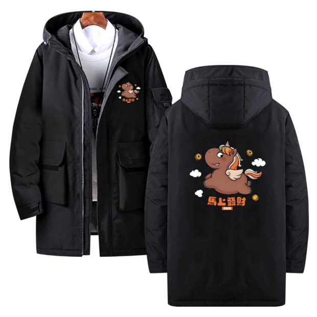 2026马年新年本命年全家福马上有钱卡通男女定制外套中长款羽绒服