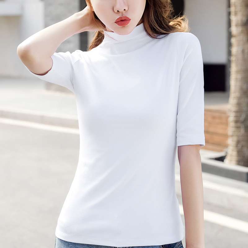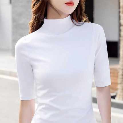 白色纯棉打底衫女半高领t恤中袖上衣小立领春秋宽松大码内搭外穿