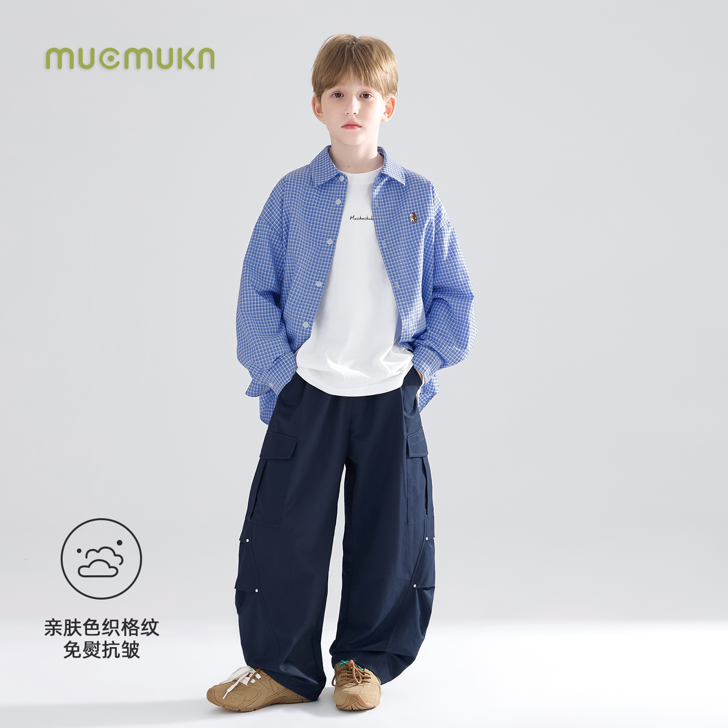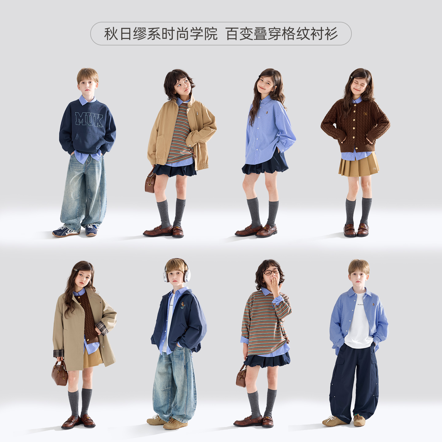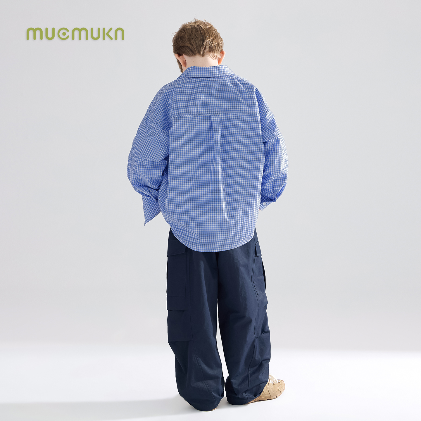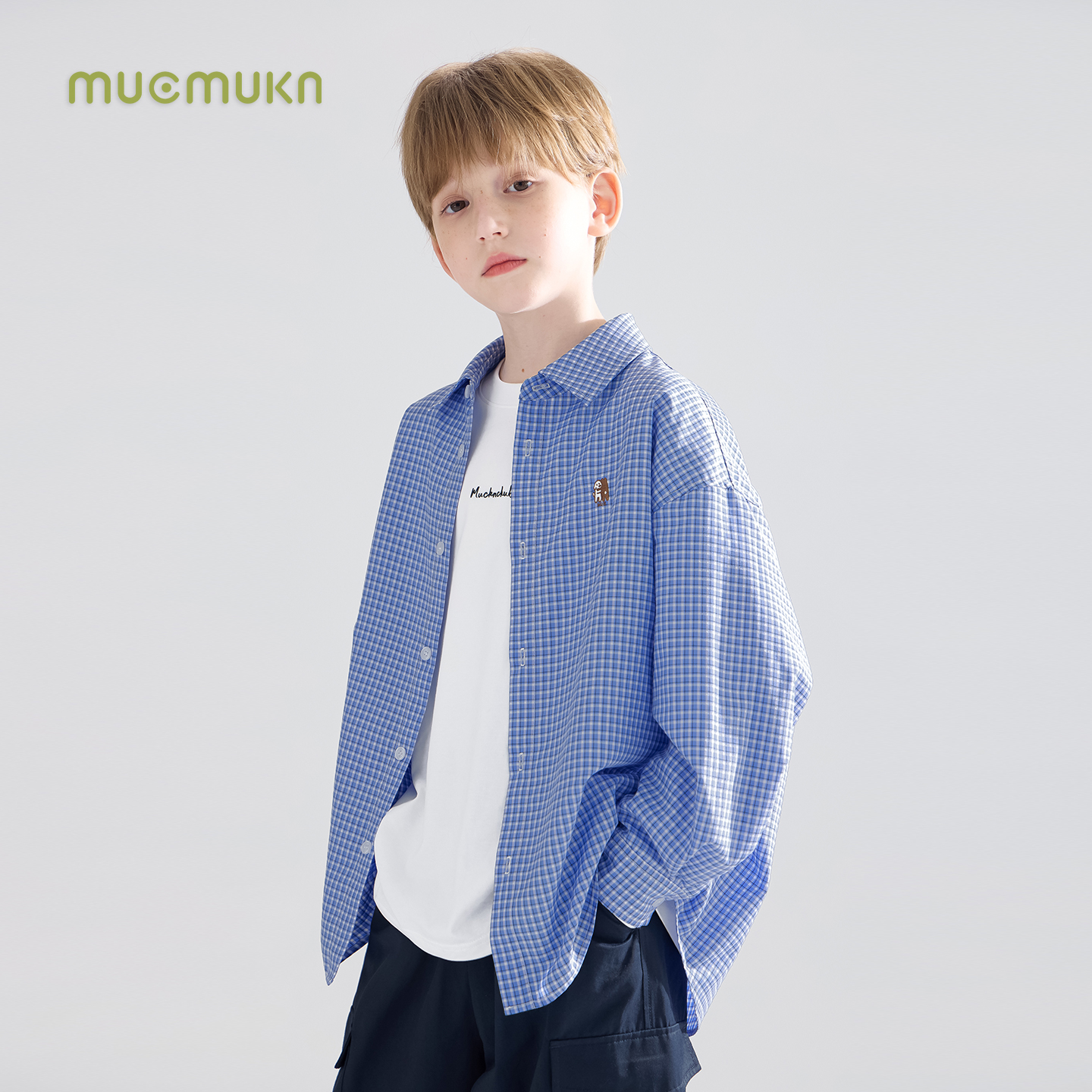 MUCMUKN童装 新款拉夫学院风衬衣绣花百搭蓝格子衬衫外套男女童