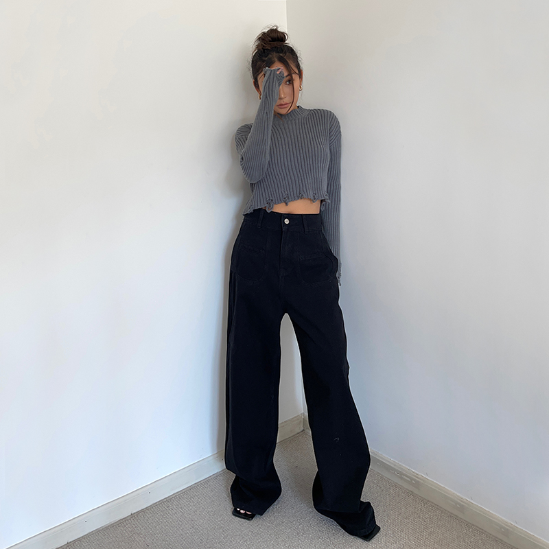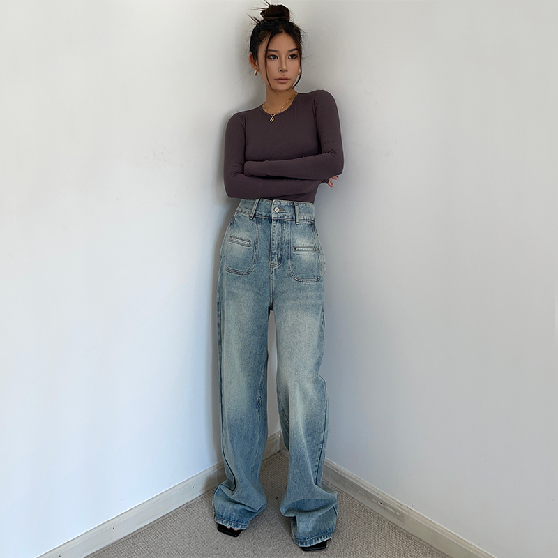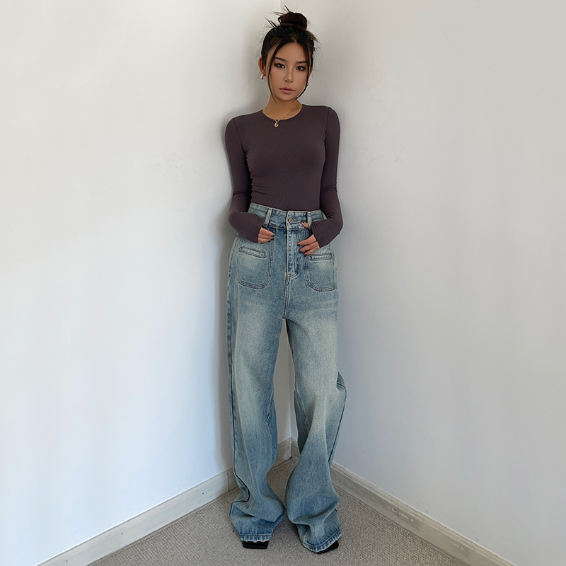 复古vibe风水洗牛仔裤口袋设计感女高街直筒宽松显瘦阔腿长裤子潮