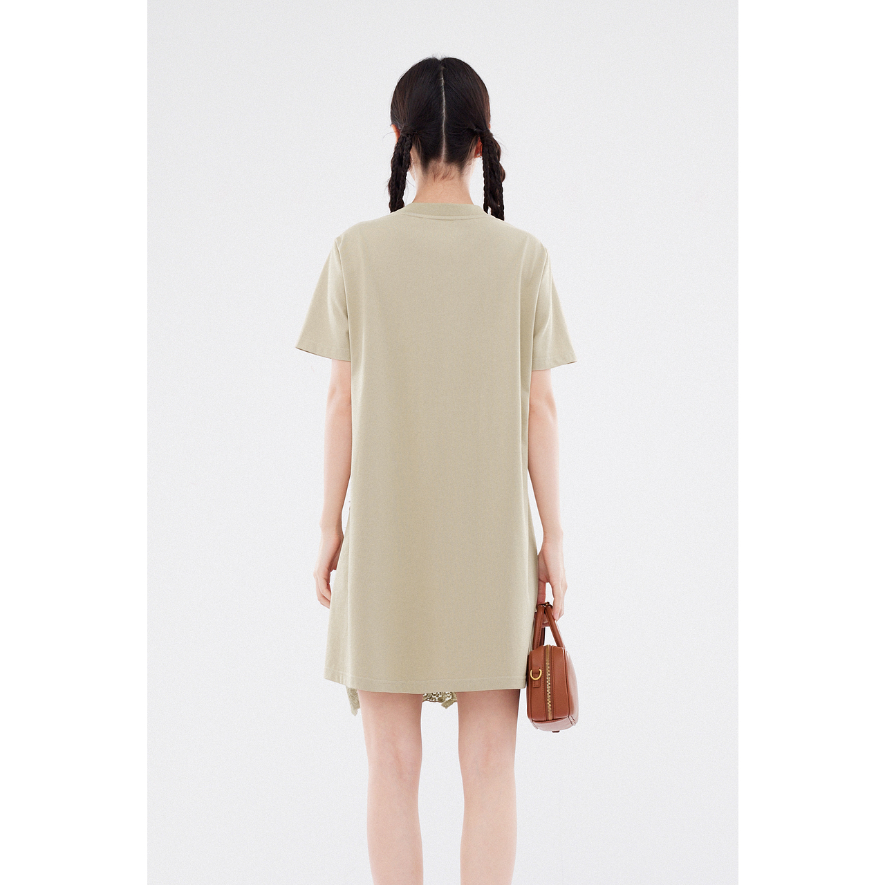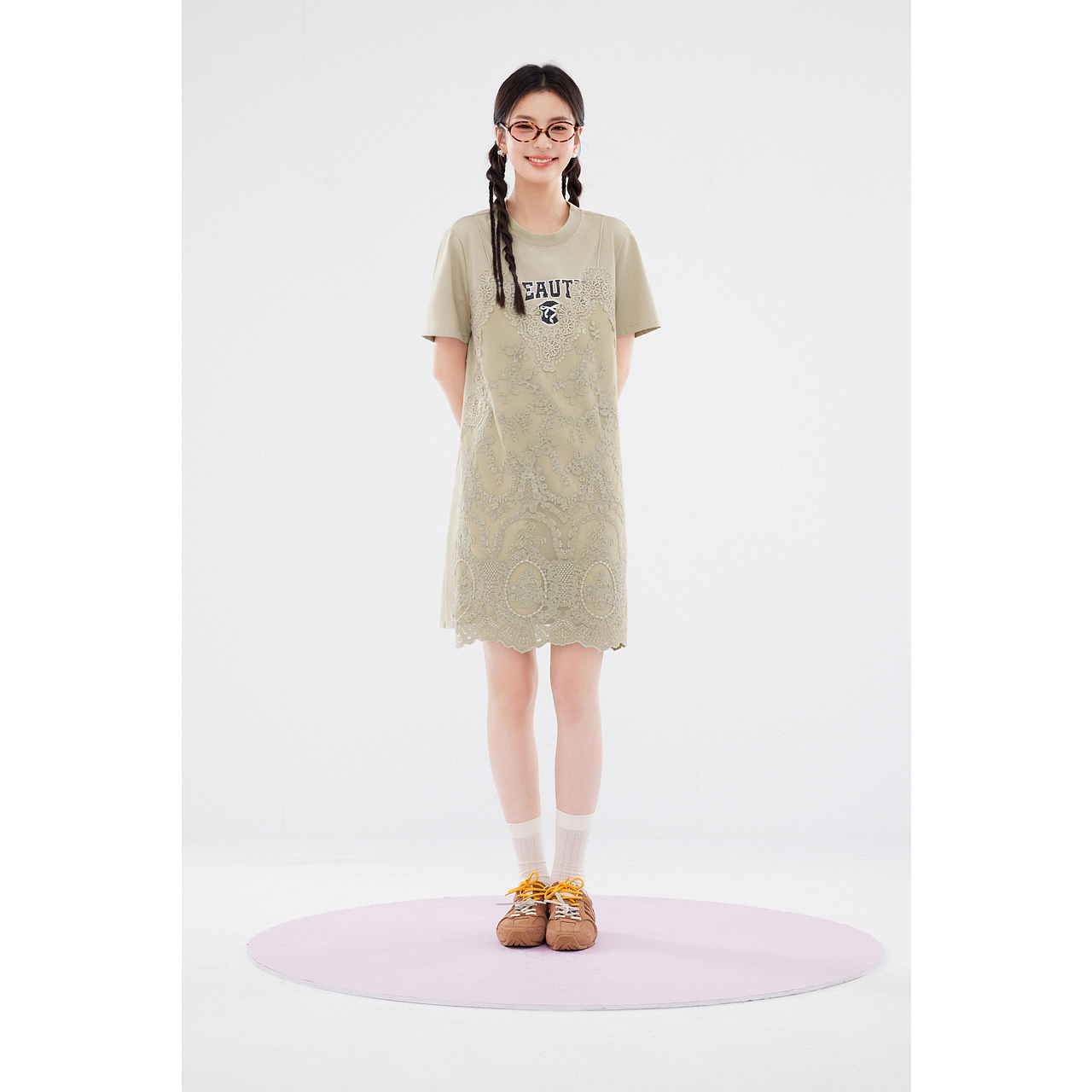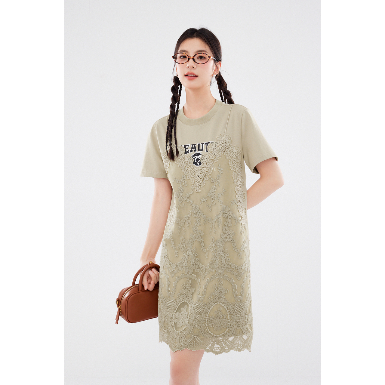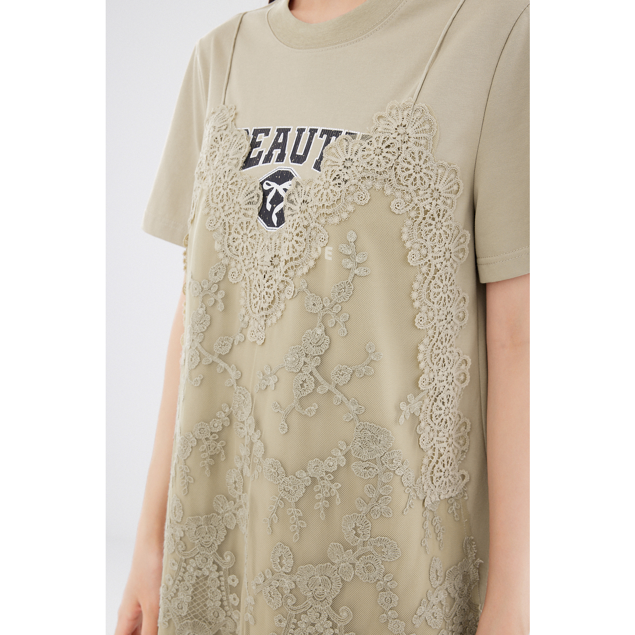 诗凡黎假两件蕾丝拼接T恤连衣裙2024夏新款洋气圆领短袖直筒裙女