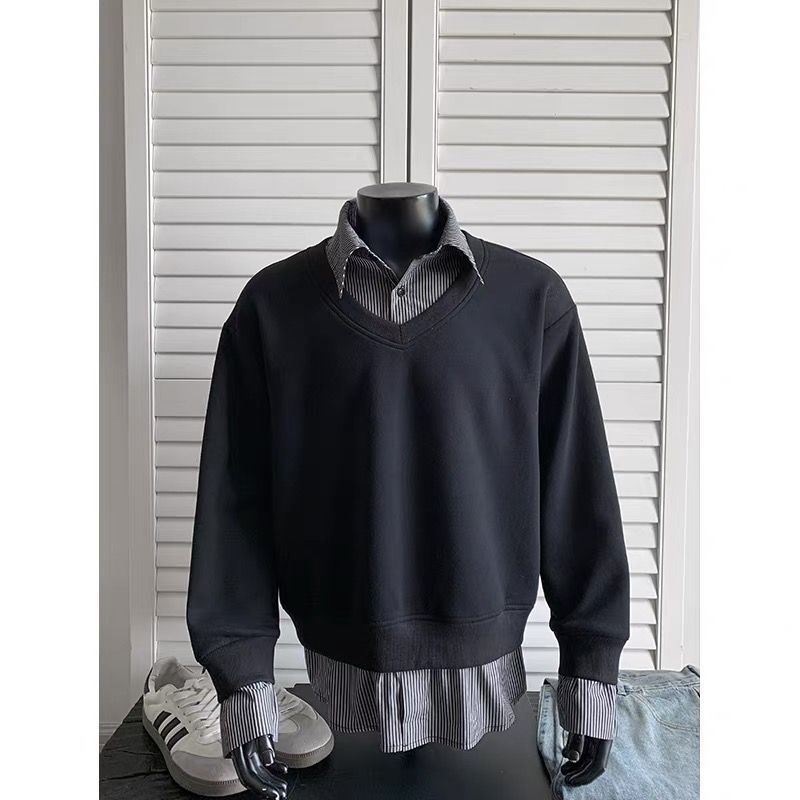 郑一穿搭【OOTD穿搭】假两件衬衫领拼接卫衣秋季男宽松套头上衣