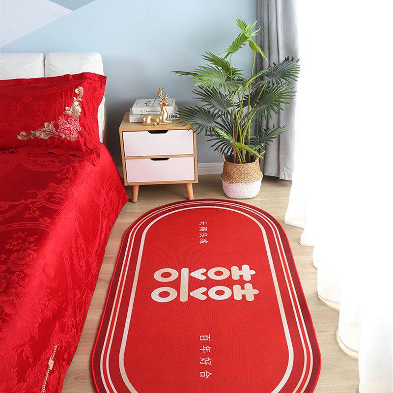 中式结婚地垫红色喜庆床边毯椭圆形床前脚垫婚房卧室装饰喜字地毯