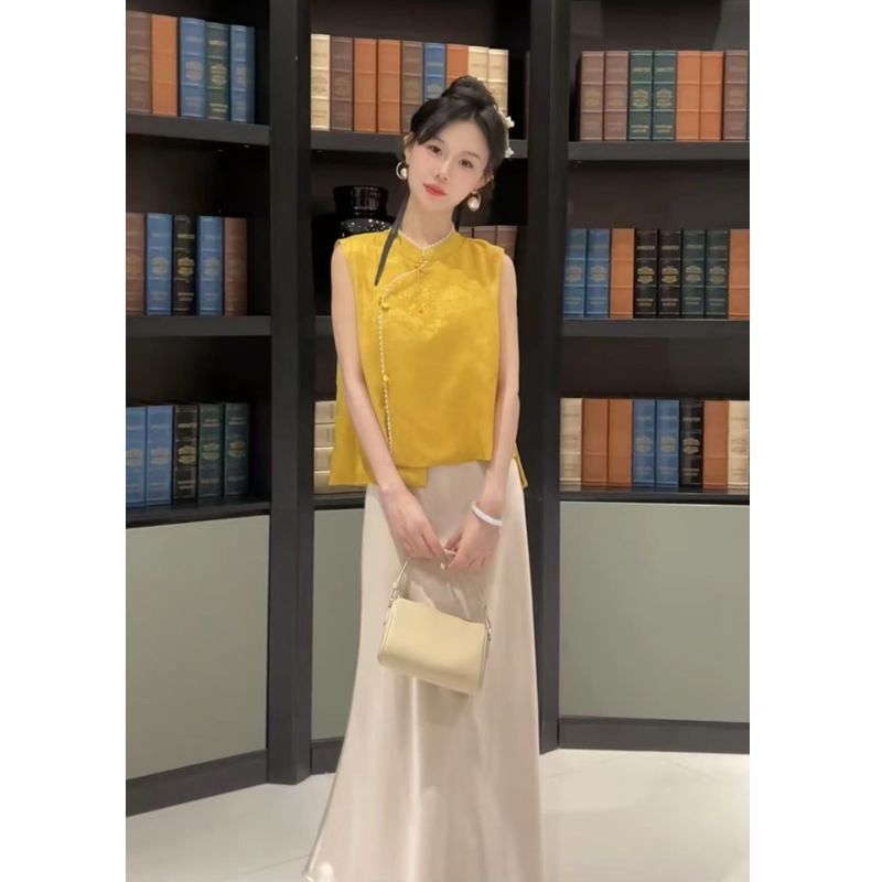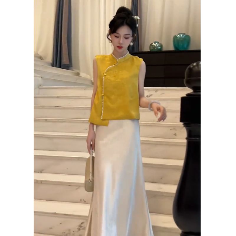 高品质清冷感新中式套装女夏季新款提花无袖上衣缎面半身裙两件套
