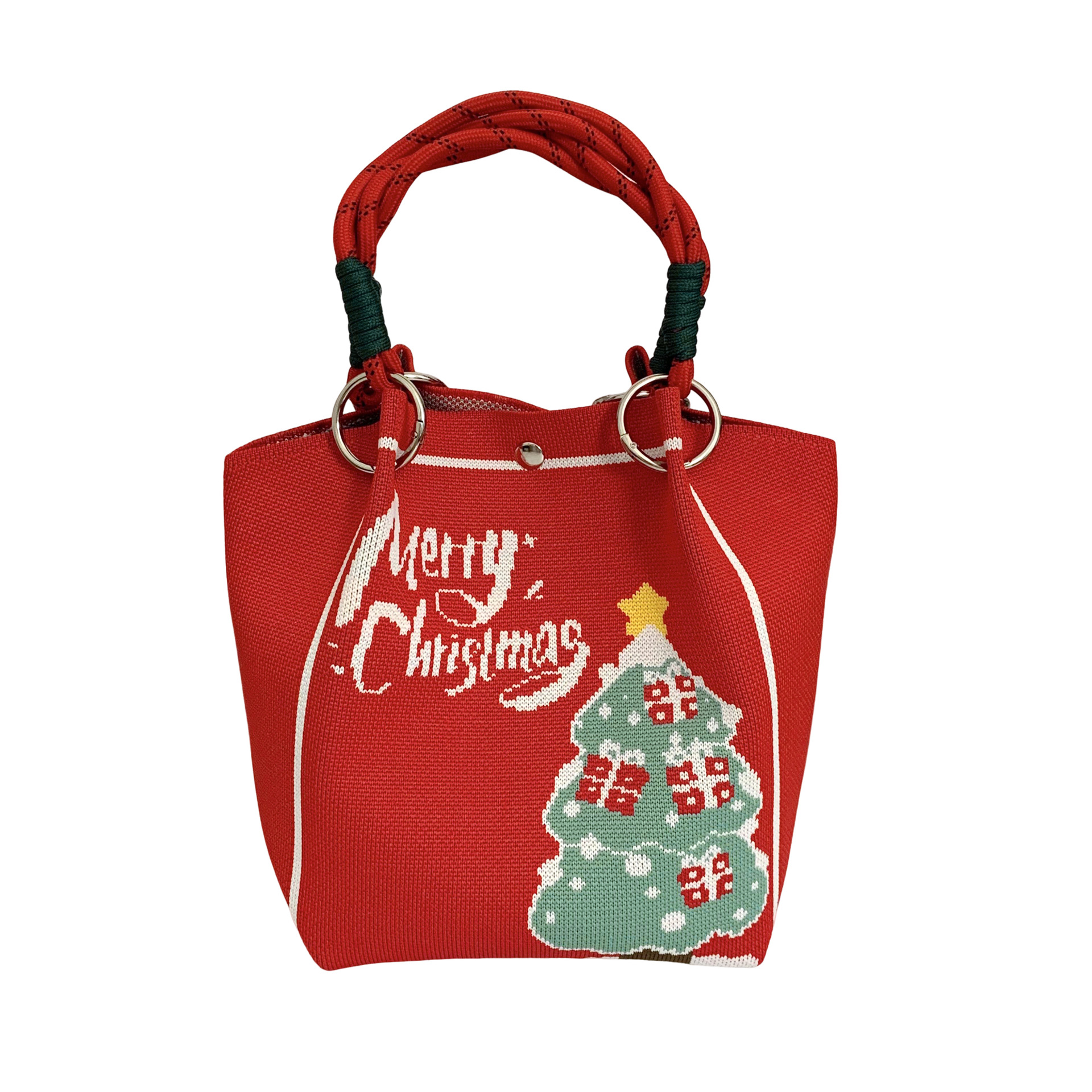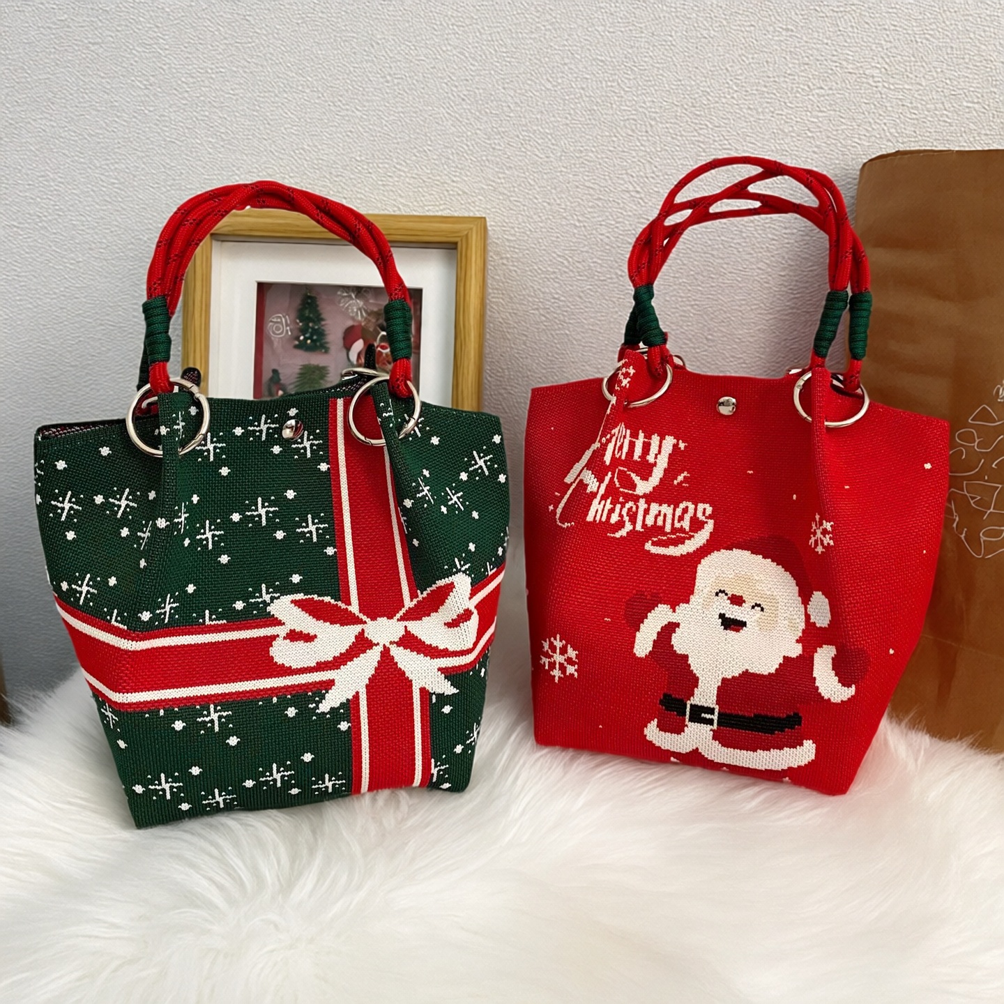 新款圣诞卡通针织手提包女大容量便携托特包红色编织包可爱手拎包
