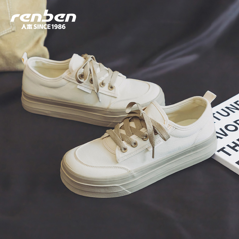 人本帆布鞋女款2025春秋新款低帮厚底透气百搭时尚休闲小白鞋板鞋