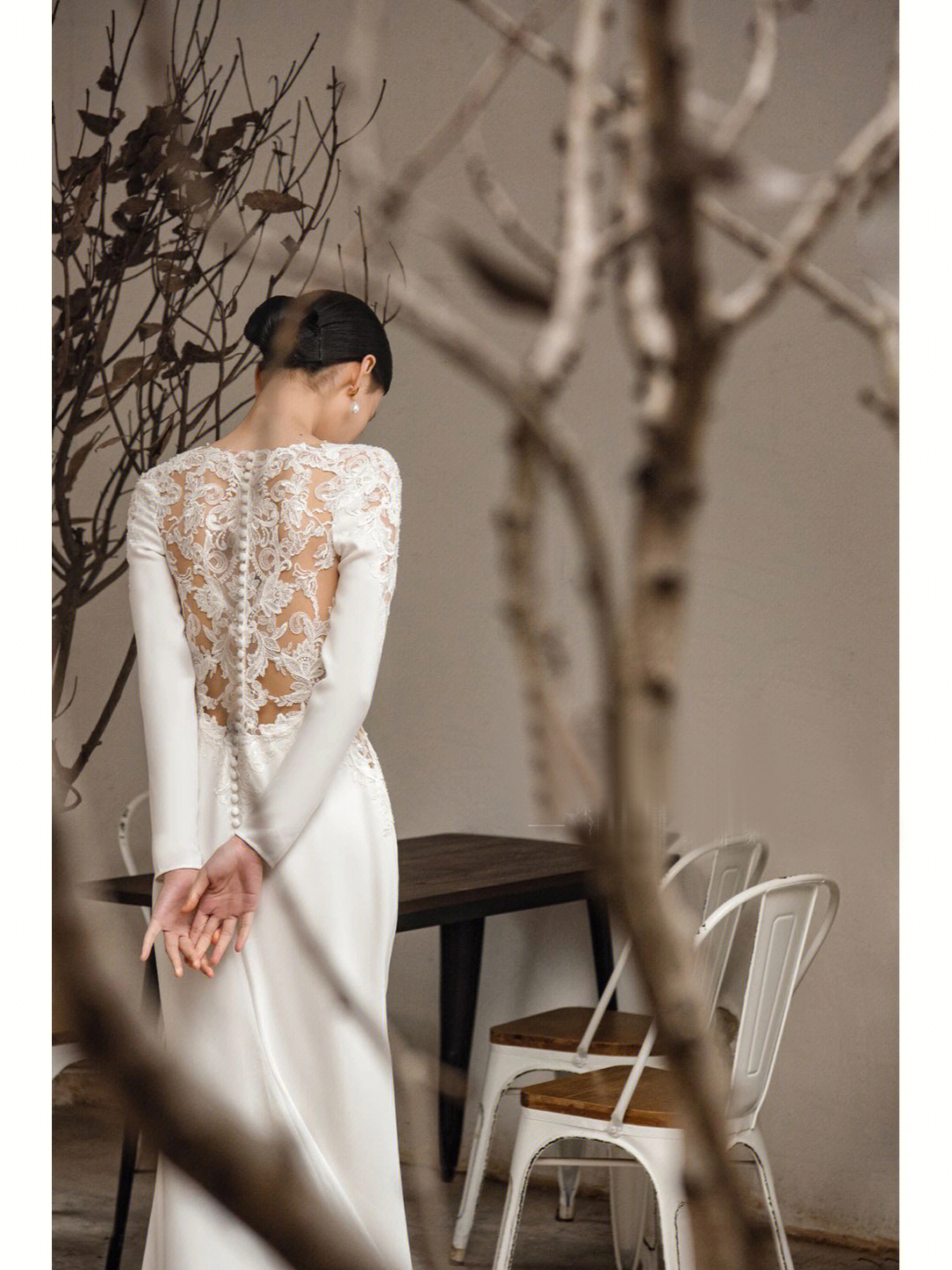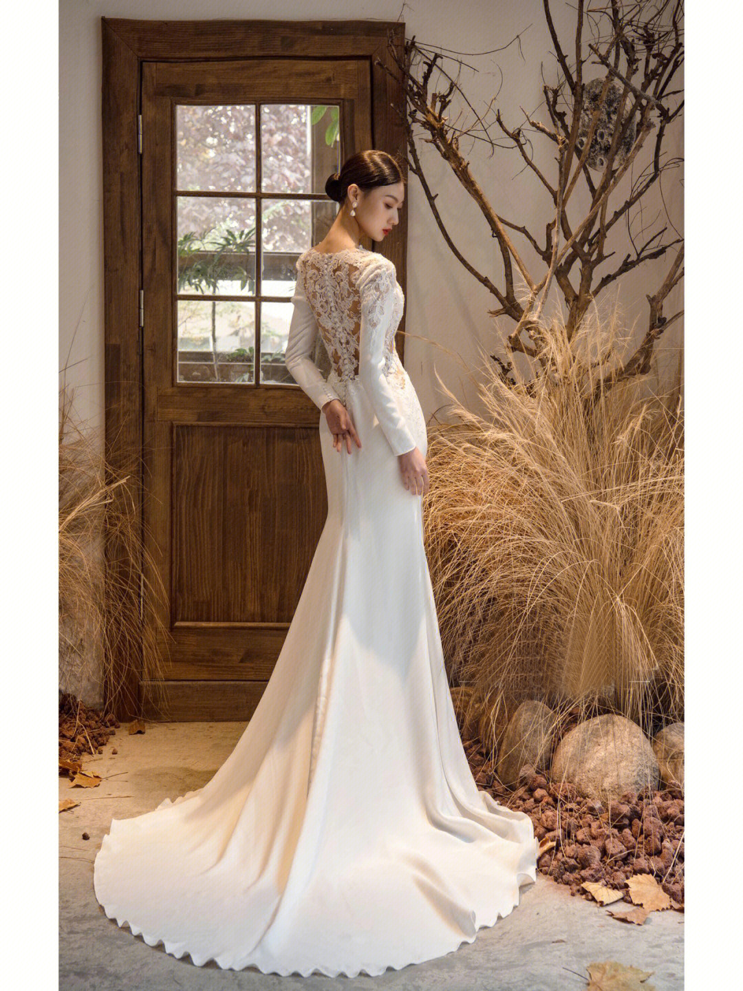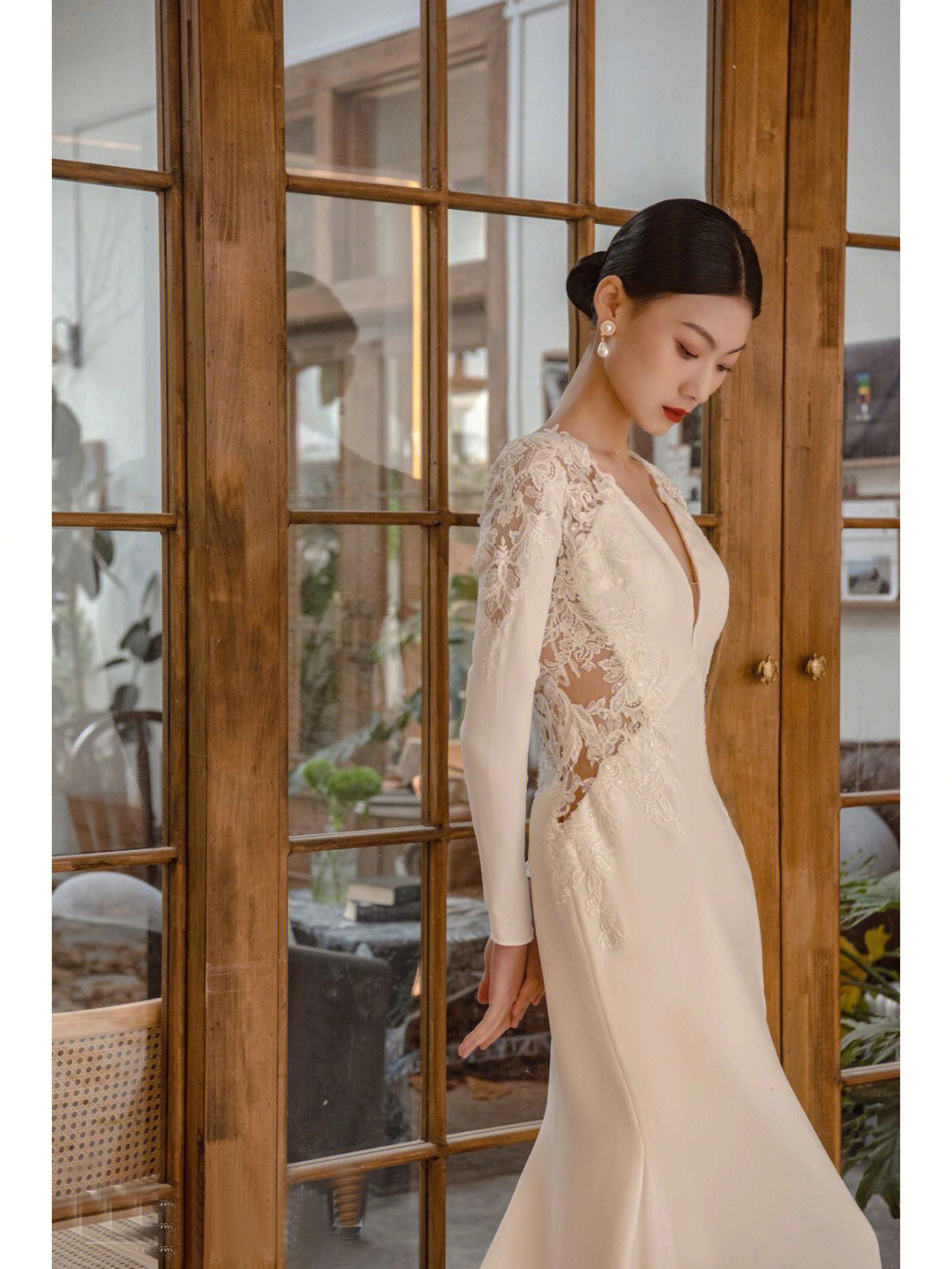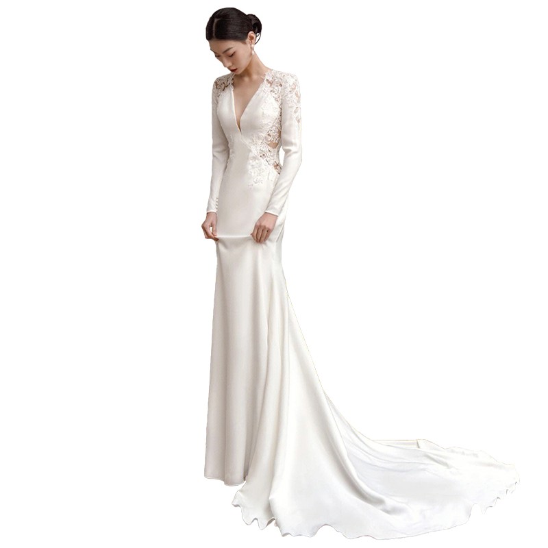 法式轻婚纱新娘长袖V领缎面蕾丝迎宾出门纱鱼尾礼服拖尾显瘦秋季