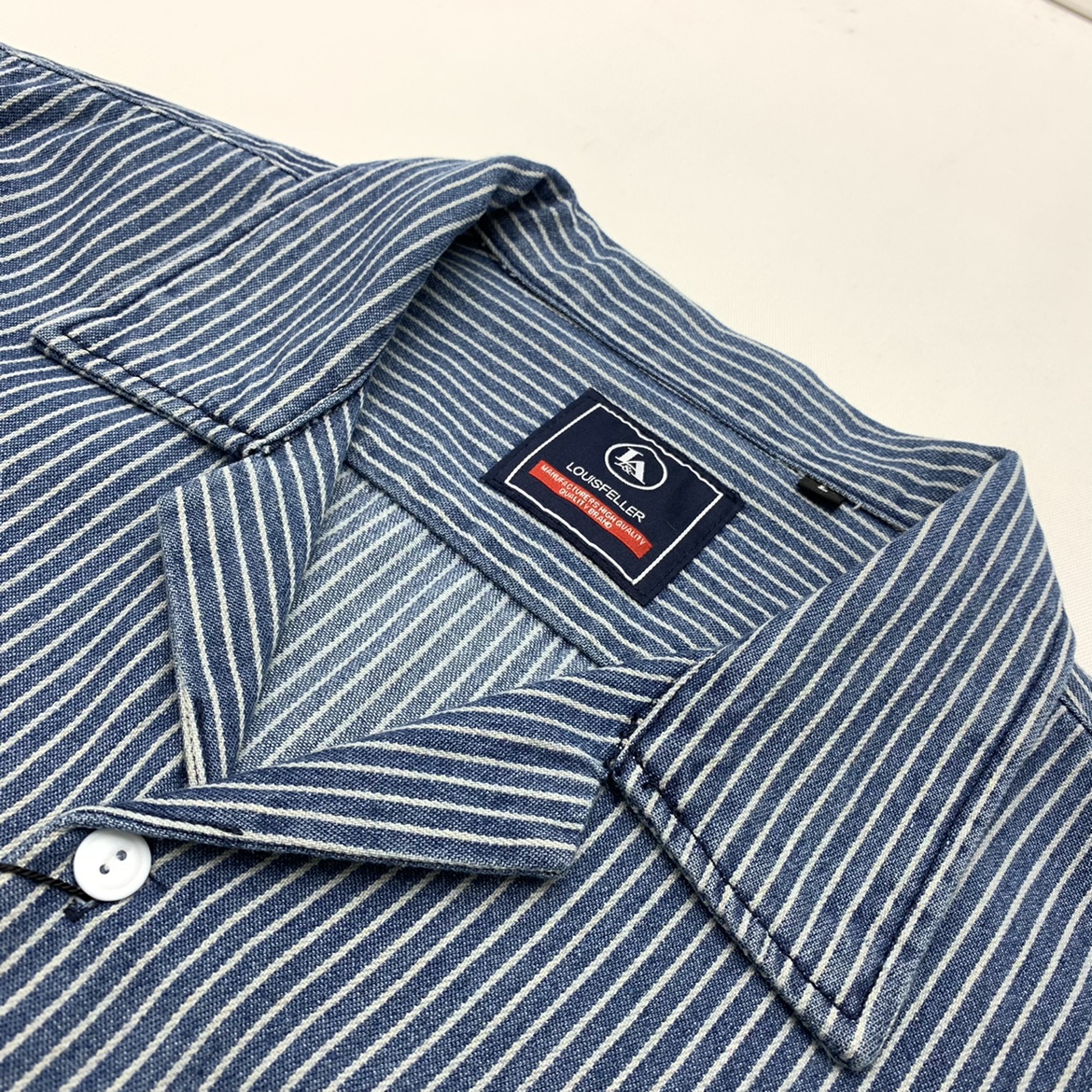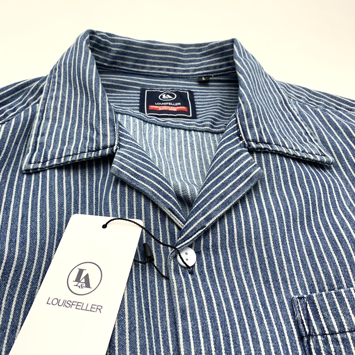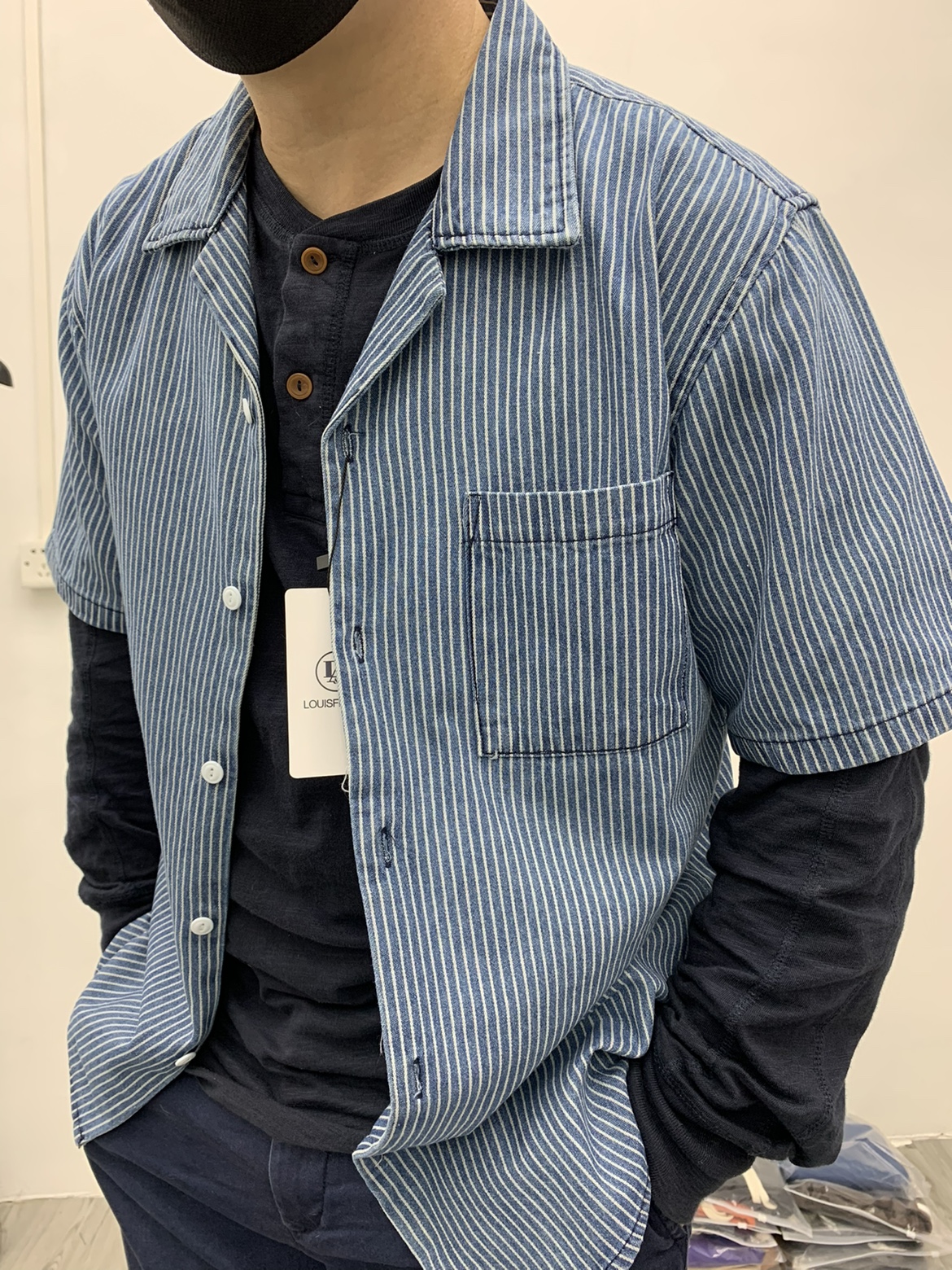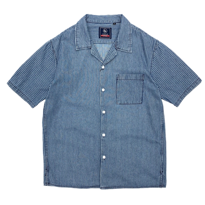 阿美咔叽美式条纹短袖衬衫男古巴领牛仔衬衣日系复古休闲港风上衣