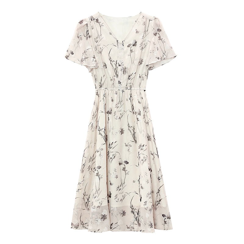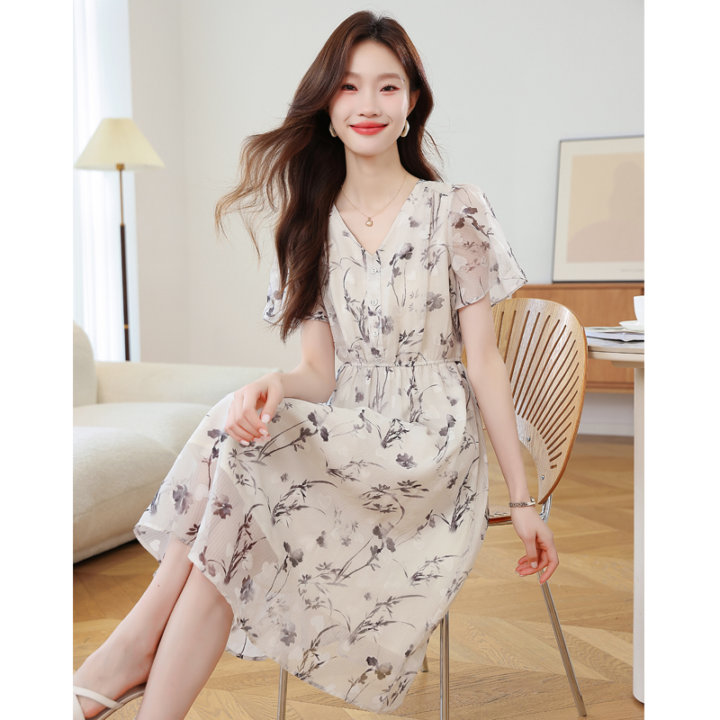 国风水墨印花V领短袖连衣裙女2025夏季新款收腰气质荷叶袖雪纺裙