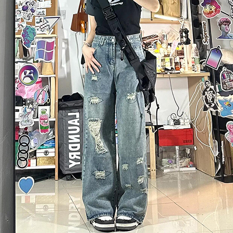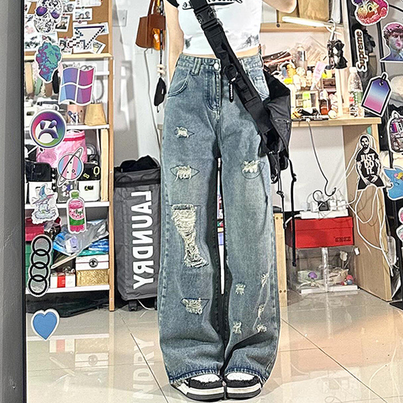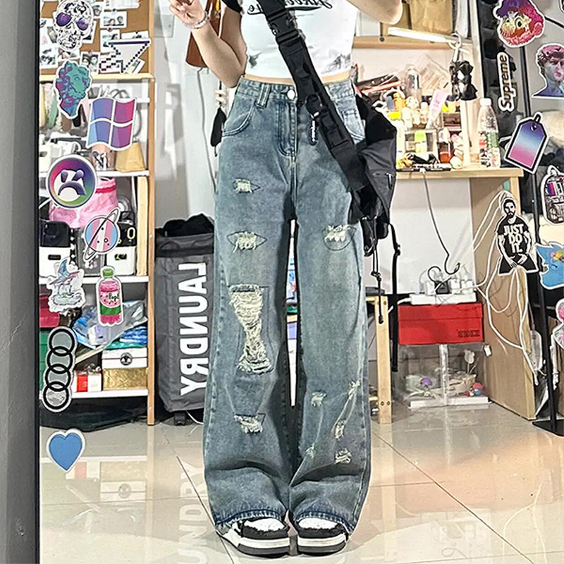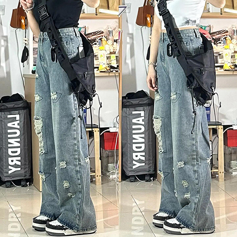 胖mm大码女装高腰显瘦破洞牛仔裤女春秋新款宽松BF慵懒风阔腿长裤