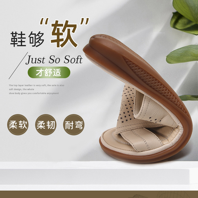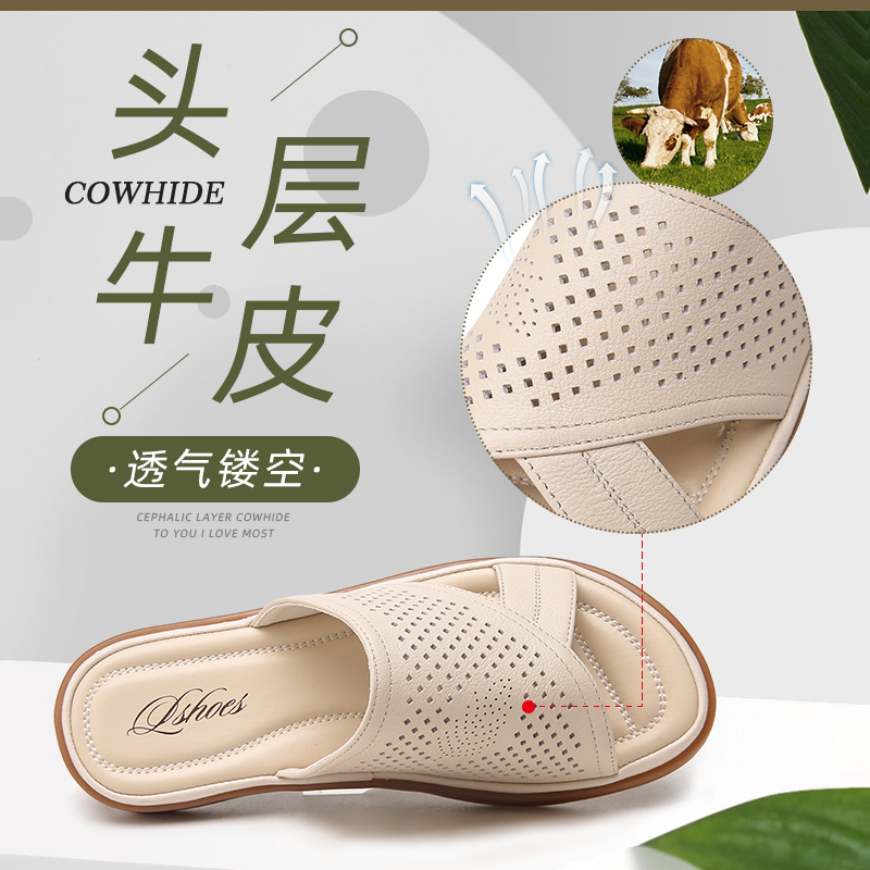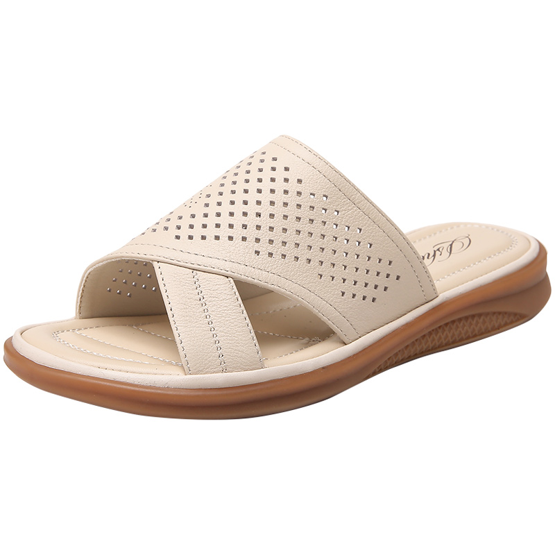 旺奈真皮软底妈妈拖鞋女镂空平底一字拖外穿中年防滑大码凉拖清仓