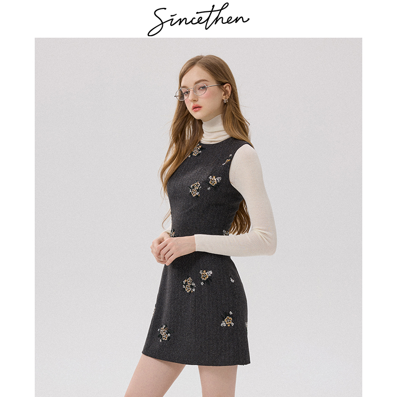 sincethen小香风连衣裙冬装背心裙冬灰色短裙冬季千金裙子秋冬女