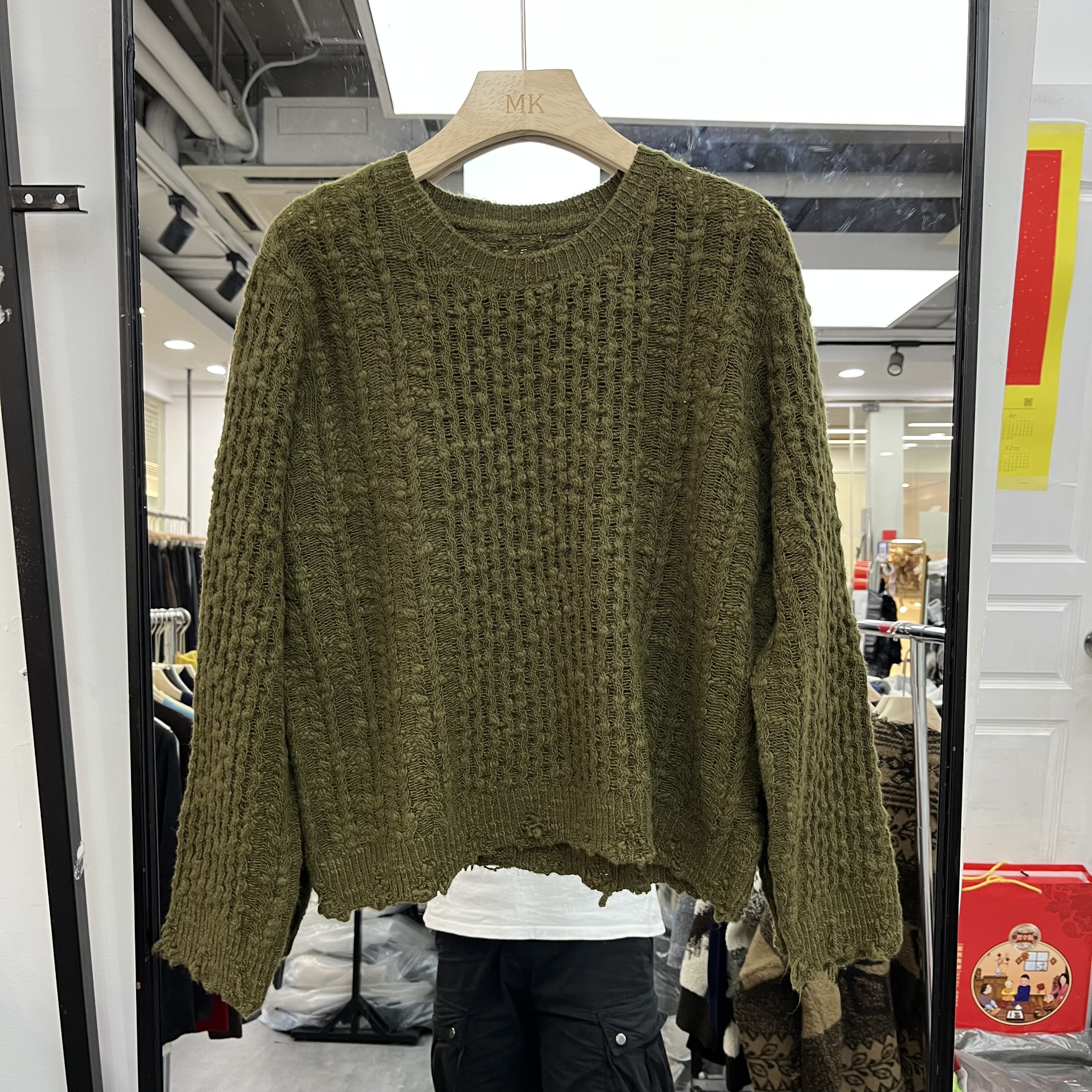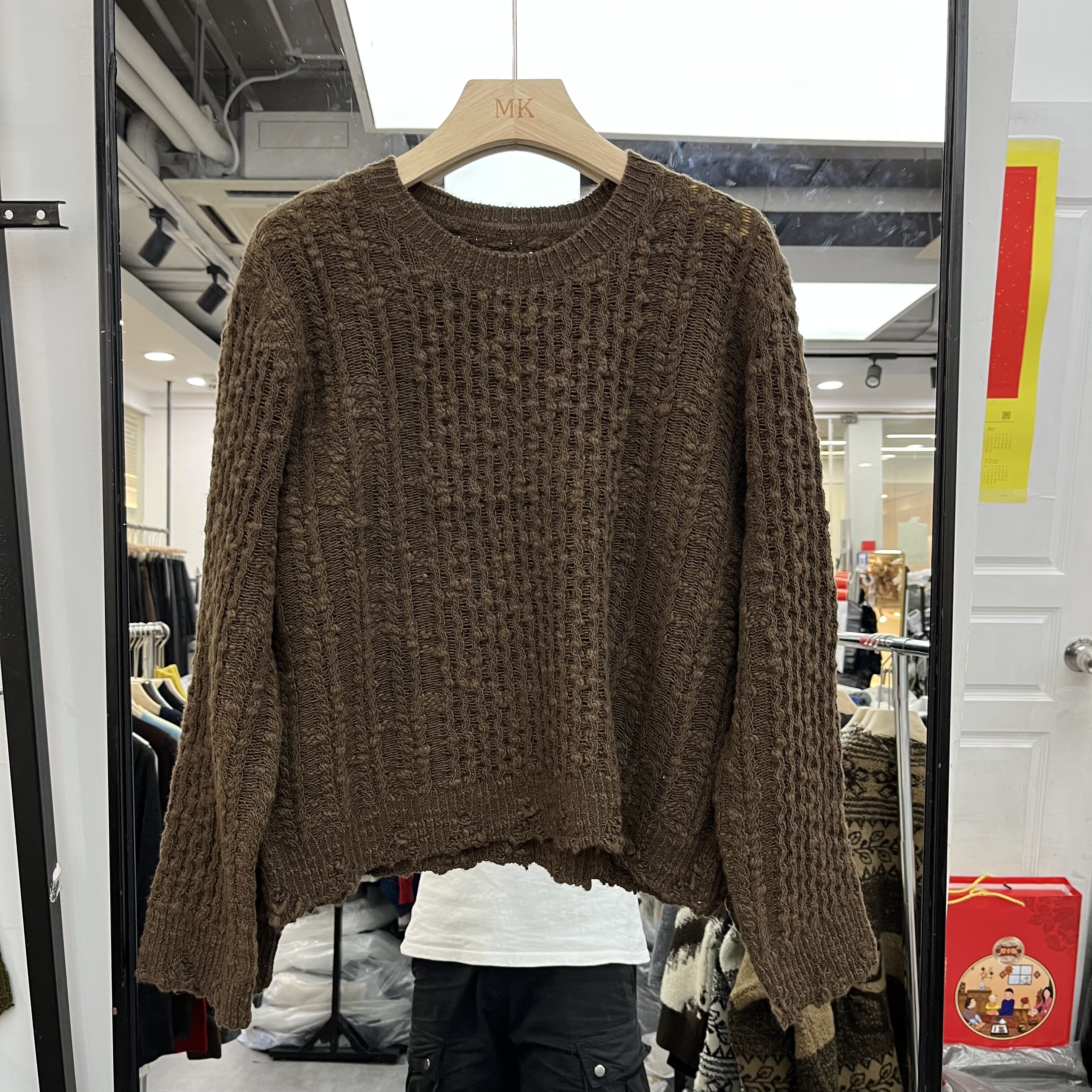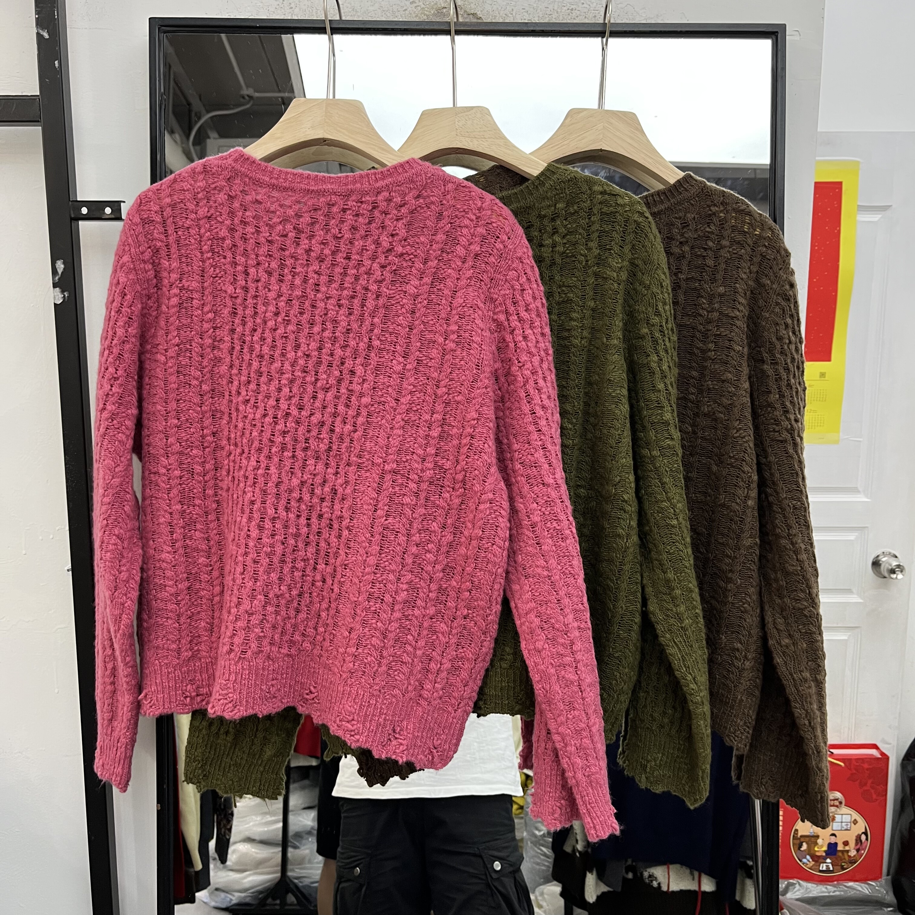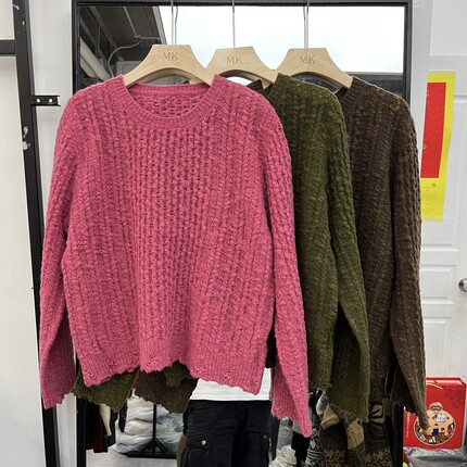 欧洲站2025秋季新款女士圆领钩花镂空全羊毛长袖毛衣欧货宽松针织