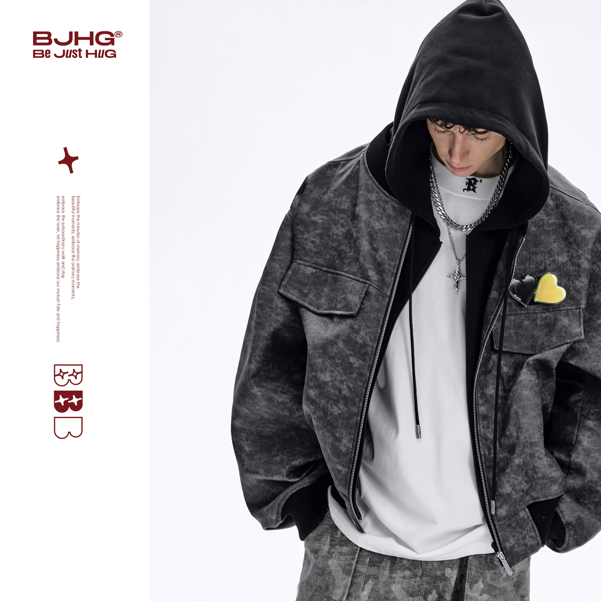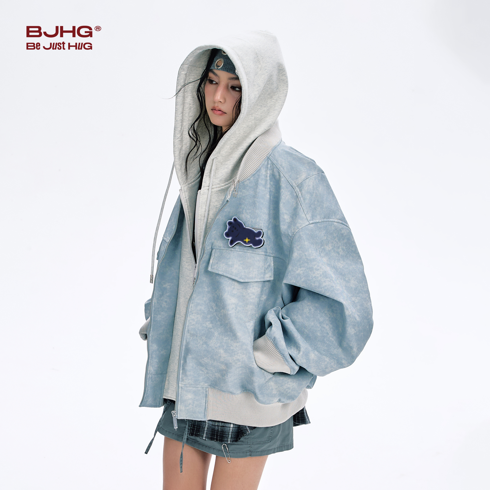 【预】BJHG不计后果贴贴美式夹克外套男秋季新款假两件连帽皮衣女
